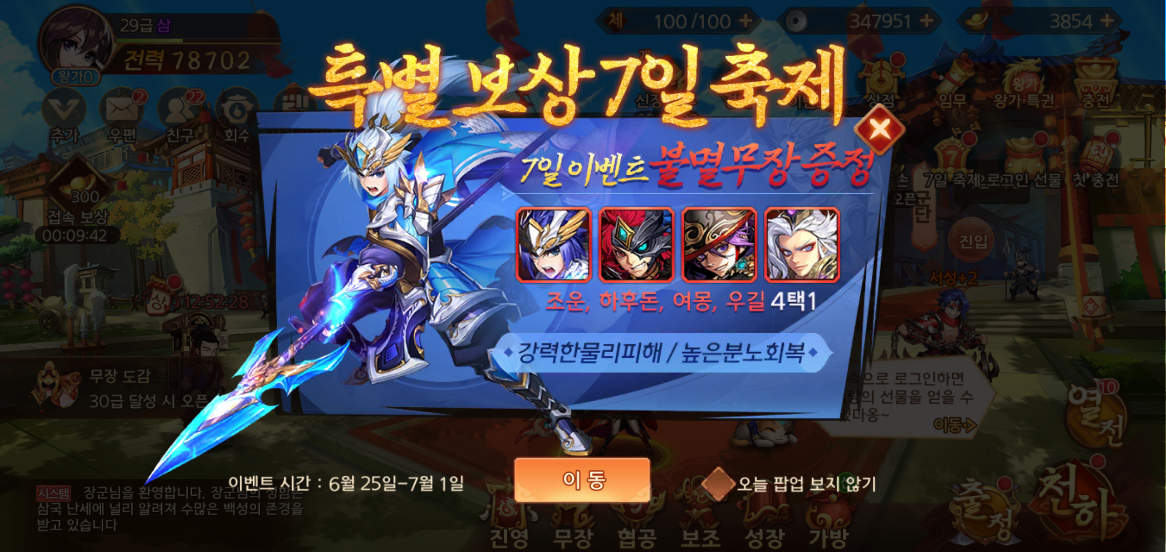 지금 그랑삼국을 즐겨야 하는 이유는 간단합니다. 혜자게임스러운 보상이 준비되어 있기 때문인데요, 7일간 접속하면 최대 5664금화와 20회 명장등용권, 신화코스튬 여기에 조운, 하우돈, 여몽, 우길 중 불멸무장을 선택할 수 있는 혜택을 받을 수 있기 때문입니다.