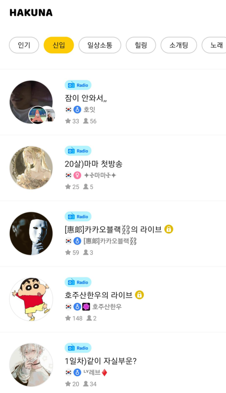 하쿠나 라이브의 경우 이미 주변 분들도 다들 알고 계실 정도로 인지도가 상당하더군요. 핸드폰만 있으면 비디오든 라디오든 원하는 방송을 선택해 시청가능한 점도 좋지만, 단순히 호스트의 방송을 시청하는 것에 그치지 않고 방송에 참여도 가능하고, 소통하면서 즐길 수 있다는 장점이 눈에 띄었습니다.