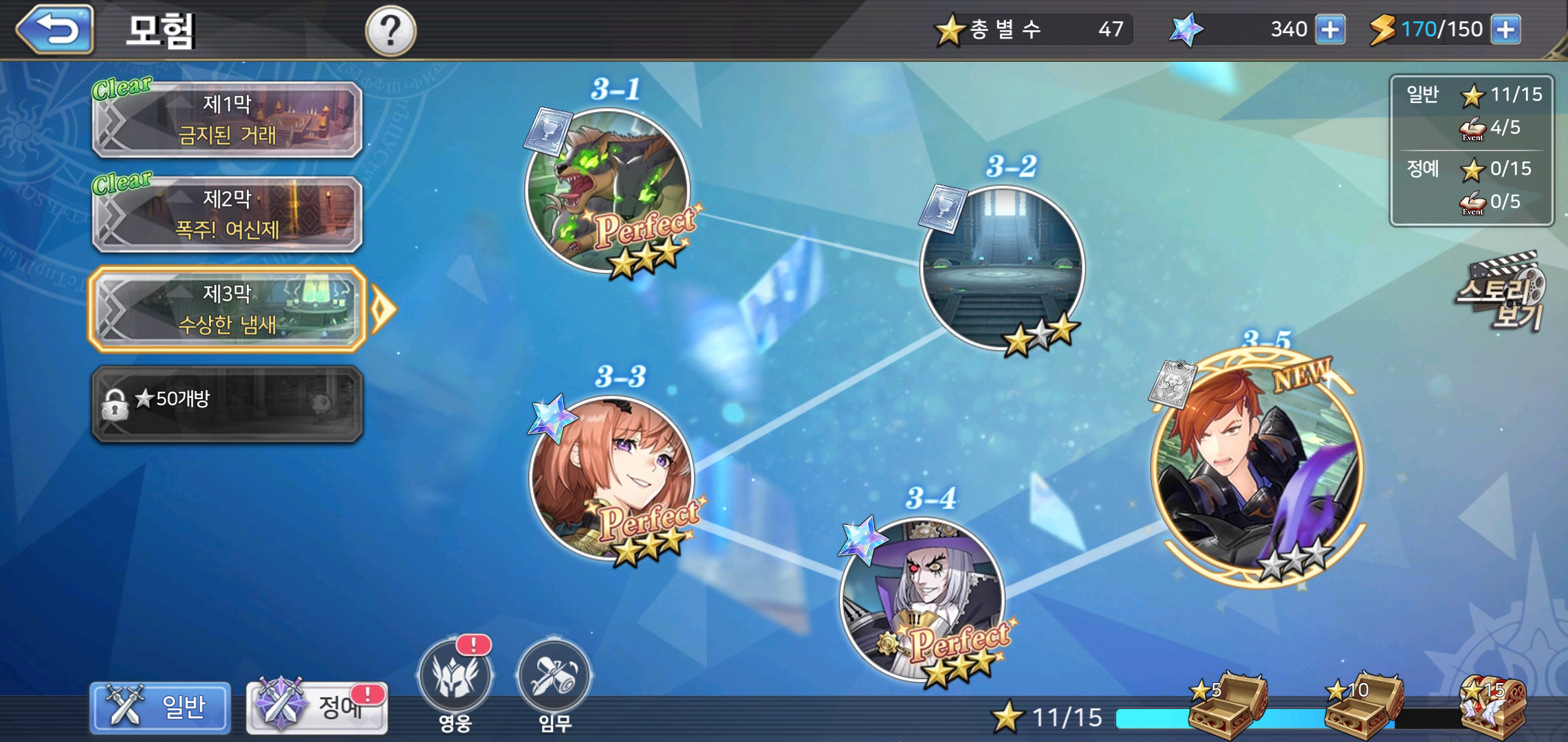 메인 스토리를 따라 진행되는 모험은 각각의 챕터와 스테이지가 구분되어 있습니다. 처음부터 서두르지 않고 차근차근 단계를 거쳐간다고 생각하면 됩니다. 모드의 경우에도 일반모드와 정예모드 두가지로 구분되어 있어 일반모드로 가볍게 시작한 후 정예모드를 클리어 하는 방식으로 진행하면 큰 무리없이 플레이를 즐길 수 있습니다.