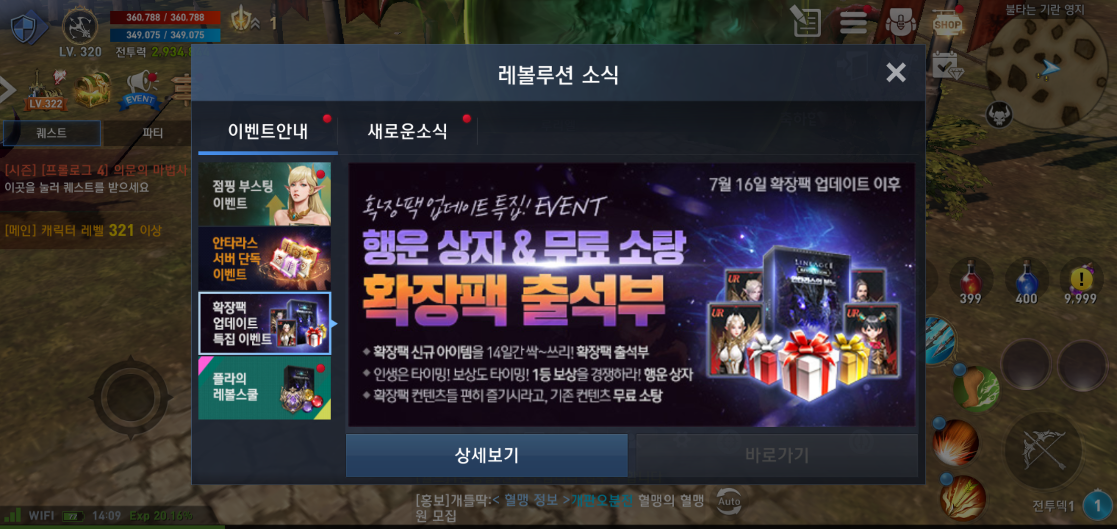 리니지2 레볼루션에 접속하면 신규 유저나 복귀유저 할 것 없이 기요틴 서버를 제외한 모든 서버에서 점핑 부스팅과 레벨업 이벤트를 통해 빠른 레벨업과 캐릭터 육성이 가능합니다. 덕분에 신서버 안타라스에 캐릭터를 생성 후 얼마 걸리지 않아 321렙을 달성했을 정도이니 말이죠.