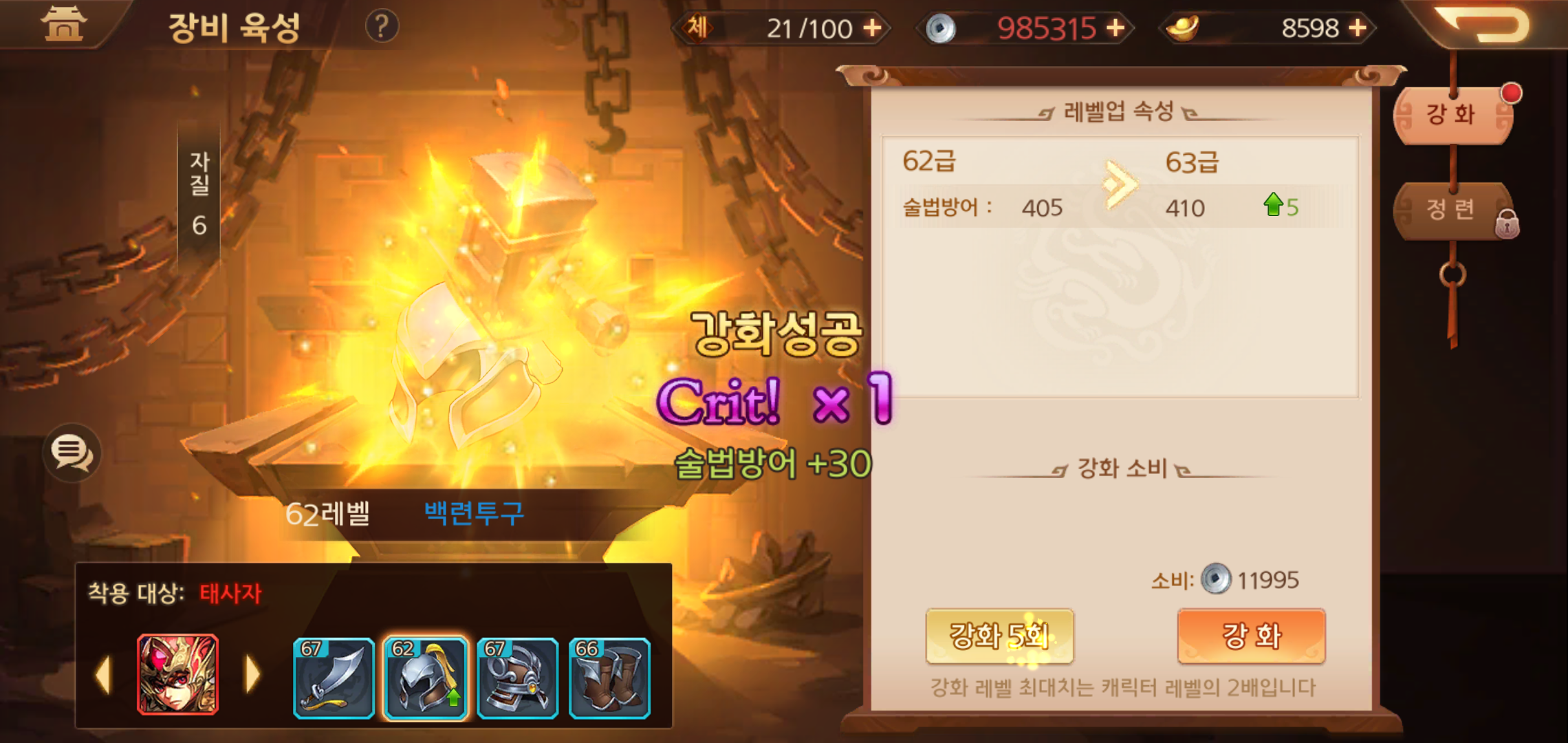 무장이 착용하는 장비도 챙겨주어야 합니다. 무장 레벨이 올라갈 수록 강화할 수 있는 레벨도 올라가는데요, 장비 레벨이 올라갈 수록 그에 따른 능력치도 올라가기 때문에 무장이 레벨업을 하면 진급 아이템과 장비강화까지 두루 살펴주어야 합니다.