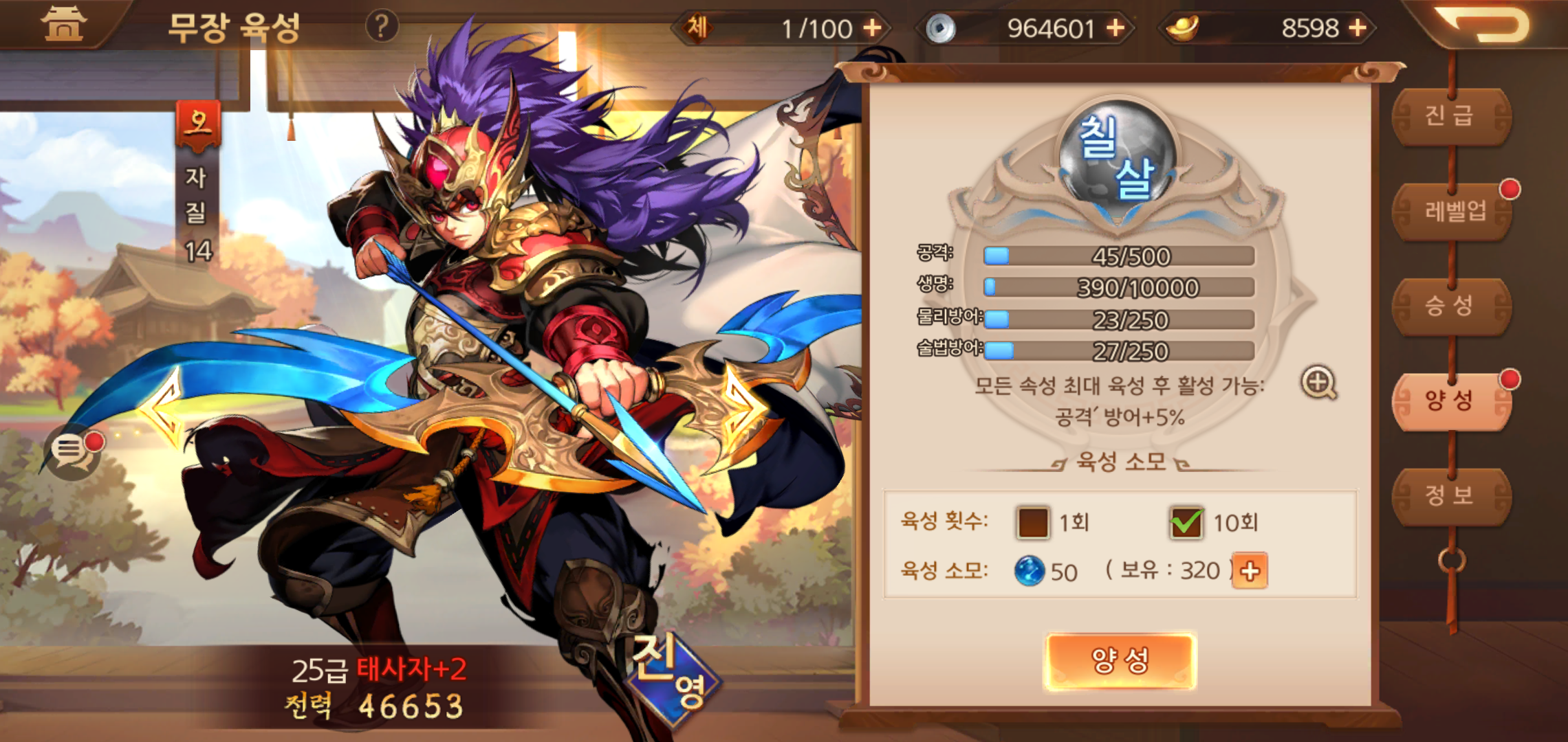 양성의 경우 가장 많은 능력치를 올릴 수 있는 방법이기도 합니다. 특히 육성 횟수도 지정할 수 있어 소모되는 아이템 보유량에 따라 진행 가능한데요, 모든 속성을 최대로 육성하면 추가적인 능력치가 활성화가 되기 때문에 빼 놓지 않고 챙겨야 합니다. 다만 소모되는 아이템을 수급하는 것이 한정적이기 때문에 무장 한명에게 올인하기 보다는 두루두루 맞춰주는 것이 중요하구요.