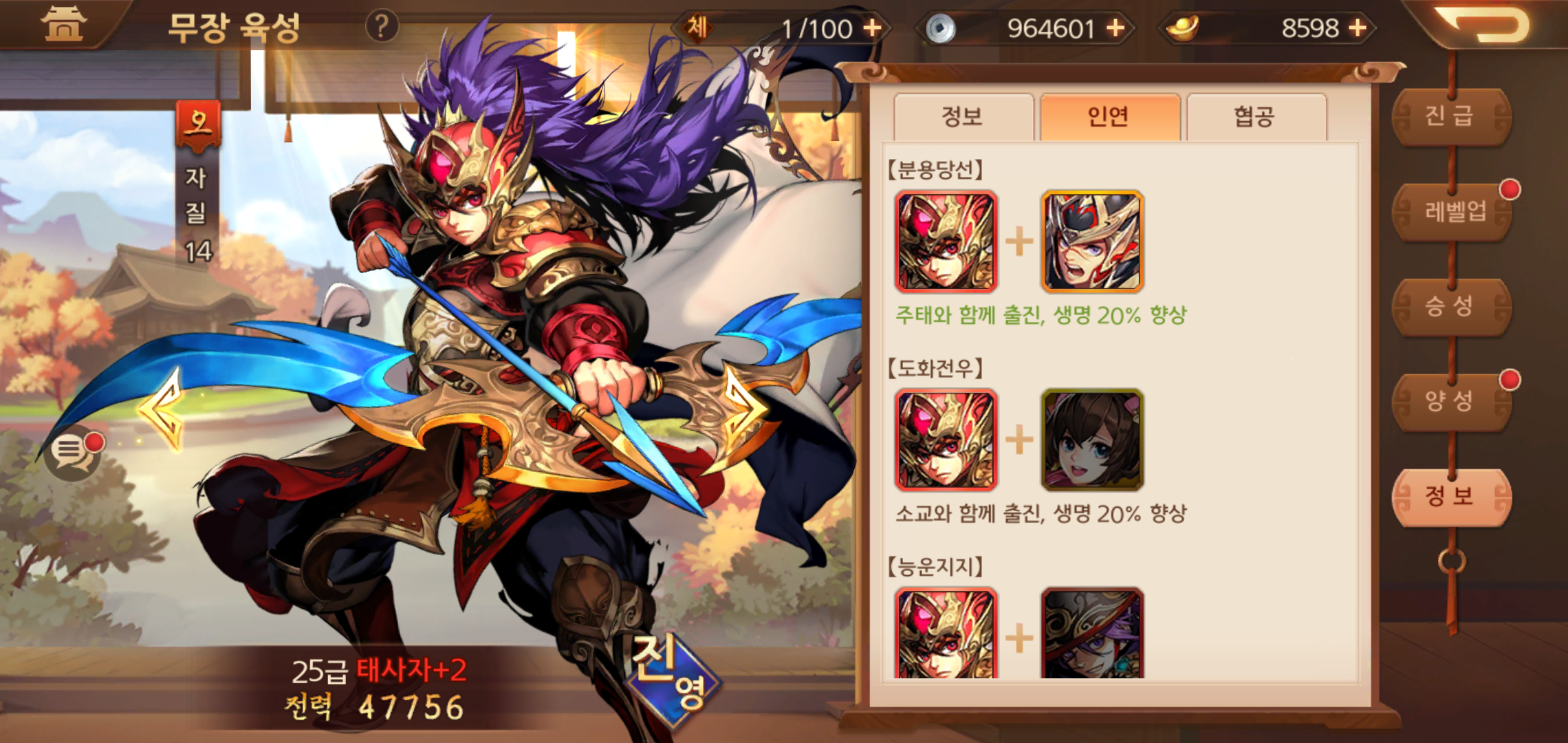 전투에 나서는 무장들을 구성하는데 있어 무장끼리 이어져 있는 인연을 활용하는 것도 중요합니다. 인연이 활성화 되면 출전하는 것 만으로도 추가 버프를 받을 수 있고, 협동공격까지 이어지면서 강한 능력을 구사할 수 있기 때문입니다. 무장을 보유하는 수가 늘어나면 늘어날 수록 마음에 드는 진영을 구축할 수 있는 점도 장점입니다.