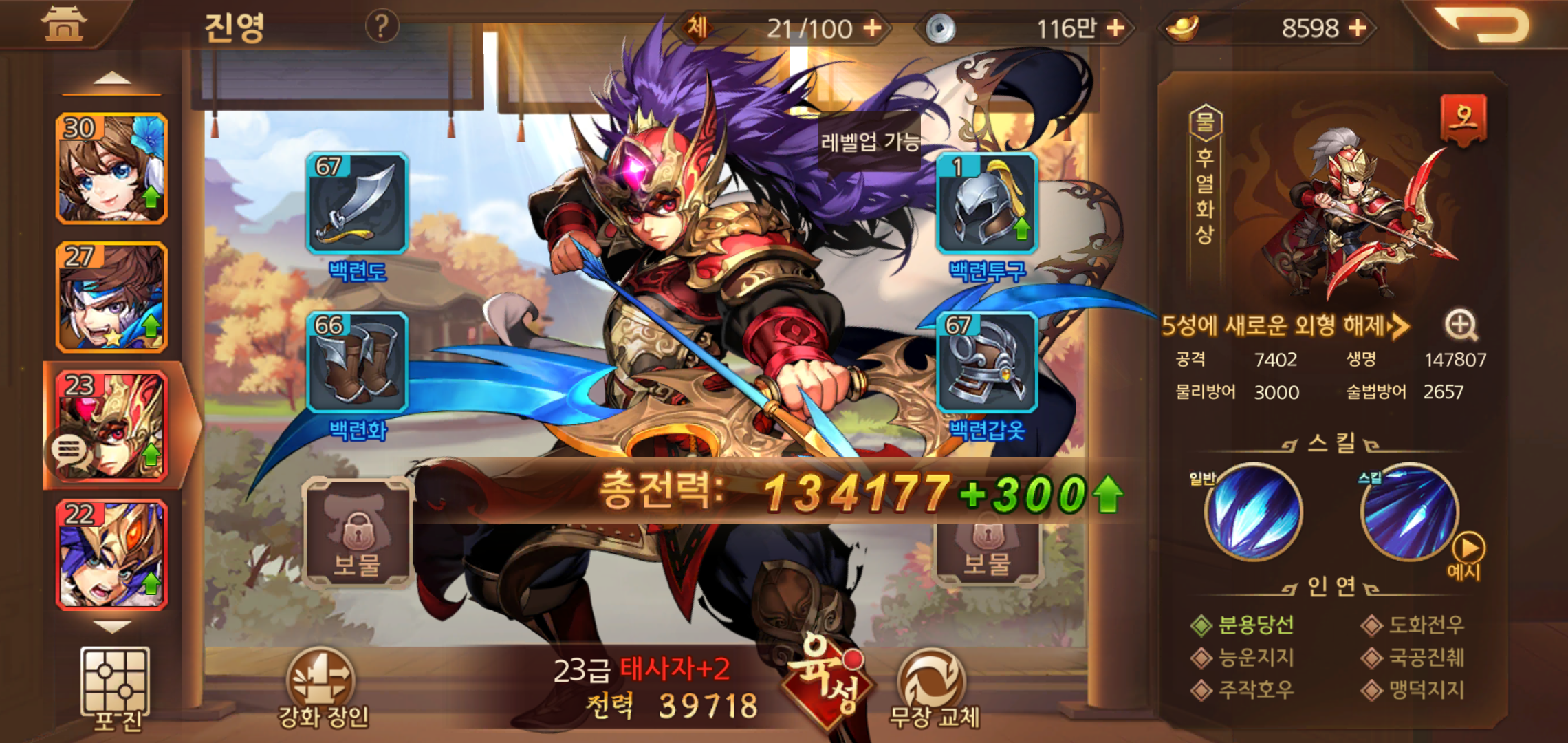 할만한게임 그랑삼국의 전투는 미리 진영으로 구성해둔 무장을 바탕으로 적진을 쓰러트리는 방식입니다. 그만큼 무장 개개인이 가지고 있는 전투력은 전력의 핵심이라고 해도 과언이 아니기 때문에 빠른 진행을 원한다면 무장들을 육성하고 유저 레벨을 올리는 것이 중요합니다.