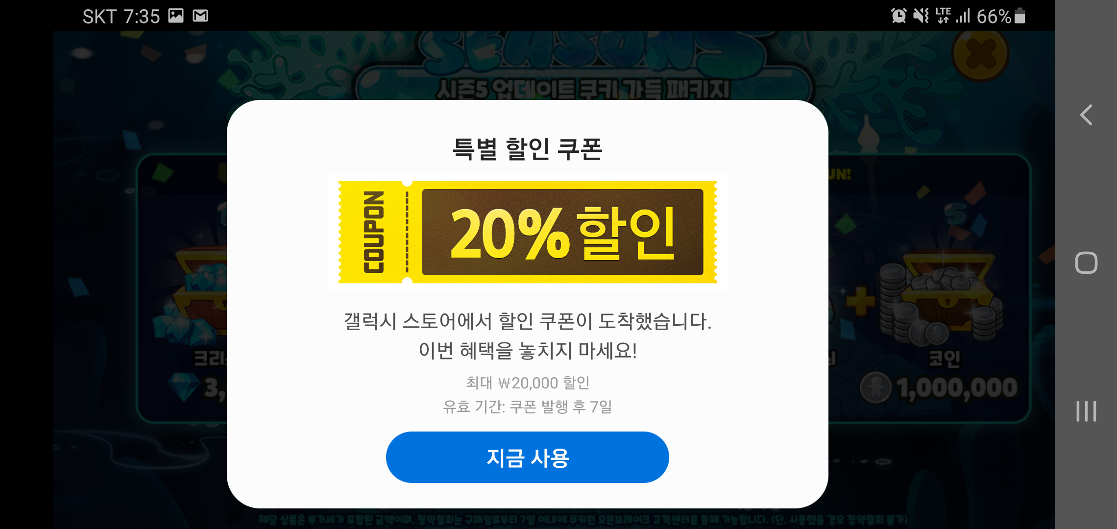 삼성 갤럭시 스토어에서 쿠키런 오븐브레이크 할인 이벤트가 시작되었습니다. 이미 플레이 중인 분들도 많고, 이제 시작한 분들도 계실텐데요, 이벤트에 참여한 한번의 할인 쿠폰을 지급하는 것이 아니라 두번, 세번까지 할인쿠폰을 받을 수 있어 빵빵한 아이템을 원하는 분들이라면 그냥 지나칠 수 없는 기회가 아닐까 합니다.