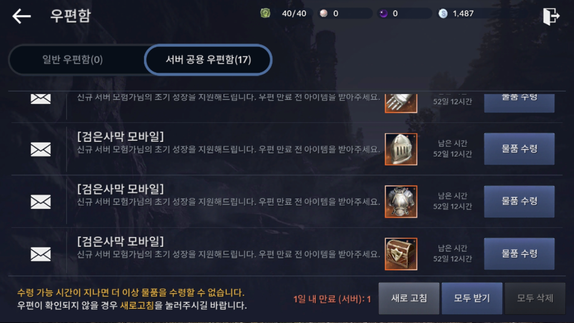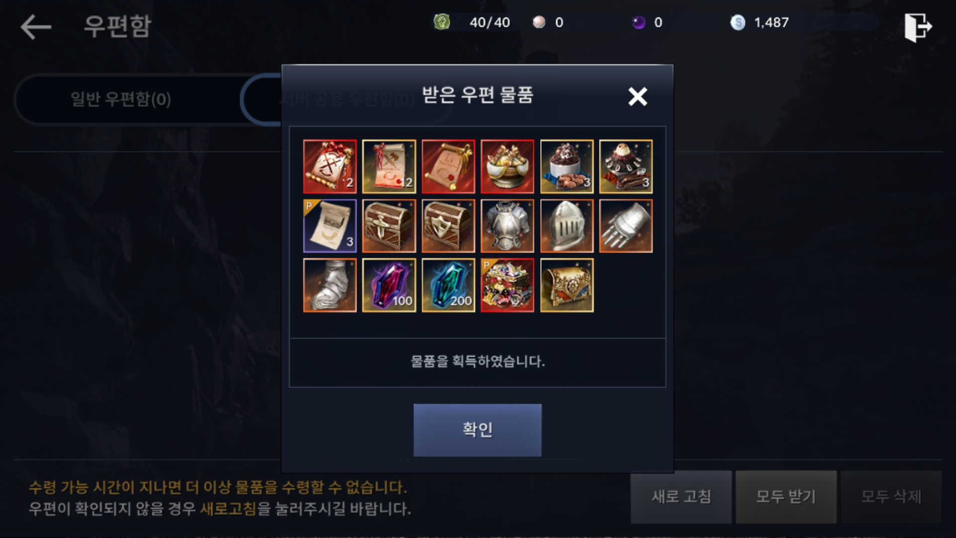 신규서버를 선택한 가장 큰 이유는 시작 시점이 동일하다는 것과 신규서버에서 주어지는 초기 성장 지원 혜택이 빵빵하다는 점이었ㅅ브니다. 아니나 다를까 서버 공용 우편함으로 신규 서버 모험가를 위한 초기 성장 아이템이 가득 도착했는데요, 웃음이 절로 나오더군요.