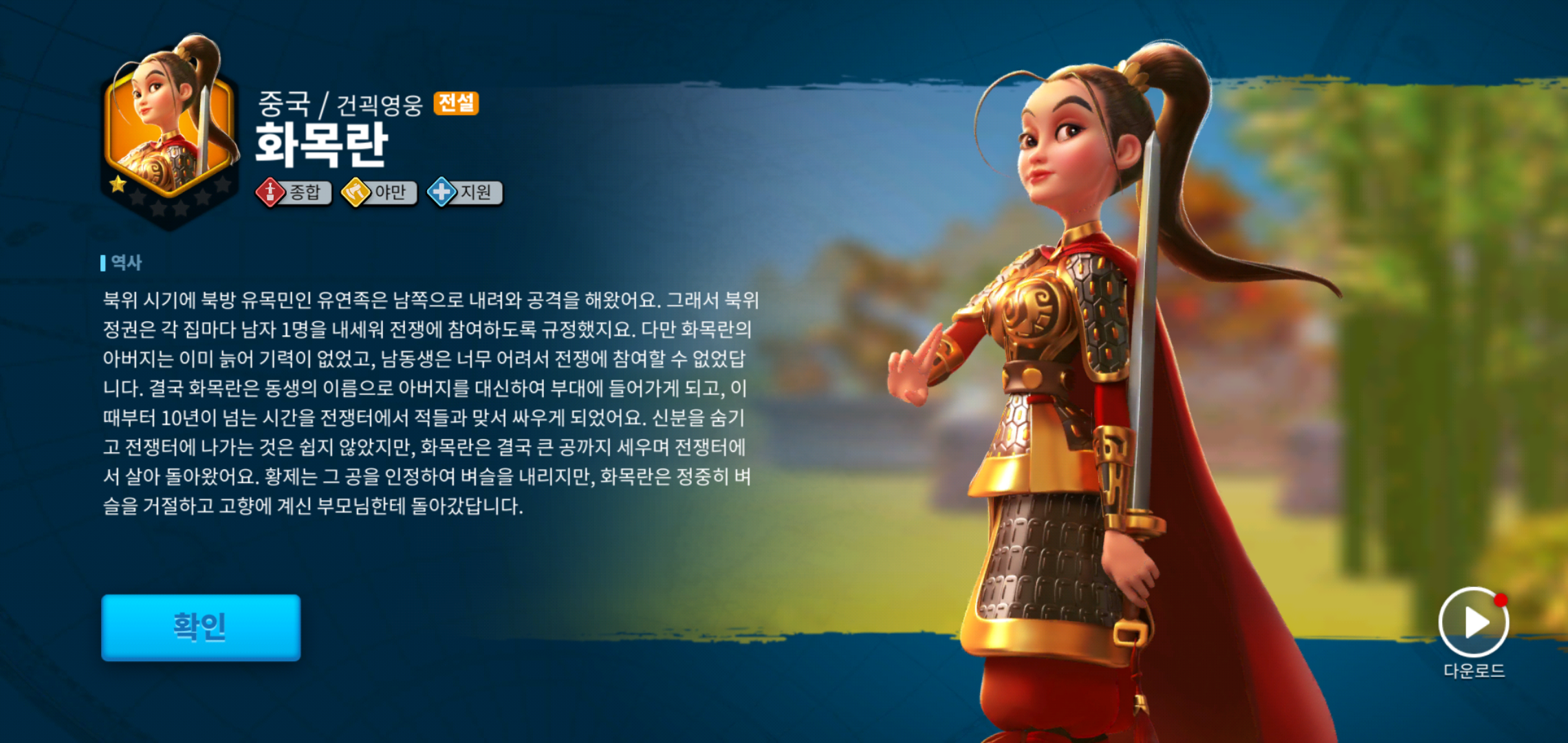 중국 건곽영웅 화목란의 경우 전설급 사령관이기 때문에 초반 왕국을 건설하는데 많은 도움을 받을 수 있는데요, 이벤트 기간동안 화목란 성장에 따른 추가 보상도 받을 수 있기 때문에 신규 유저, 복귀유저 할 것 없이 상당한 도움을 받을 수 있습니다.