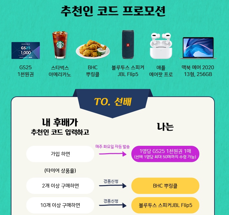추천인 이벤트는 신규 가입자가 추천인 코드를 입력하고, 필요한 제품을 누적 구매할 때마다 추가 선물을 받을 수 있습니다. 먼저 신규 가입자가 추천인 코드만 입력해도 1명당 GS25 1천 원 기프티콘을 받을 수 있고, 타이어를 구매하는 수량에 따라 BHC 뿌링클 선물을 시작으로, JBL 블루투스 스피커, 에어팟 프로, 맥북 에어 등 다양한 선물을 받을 수 있습니다.