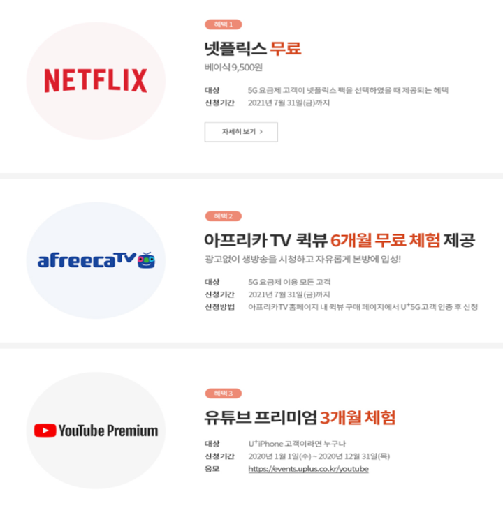 유플러스 아이폰12사전예약시 프리미엄 요금제를 선택하면 그에 따른 추가 혜택도 주어집니다. 우선 넷플릭스를 무료로 이용할 수 있고, 아프리카TV 퀵뷰 6개월 무료 체험과 유튜브 프리미엄 3개월 체험까지 받을 수 있습니다. 요즘처럼 모바일로 영상물을 자주 접하는 분들이 많은 만큼 딱 좋은 혜택이 아닐까 싶습니다.