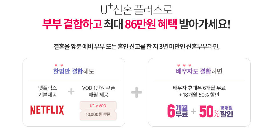 싱글에게는 아쉽지만, 신혼부부라면 딱 좋은 혜택도 주어집니다. 결혼을 앞둔 예비 부부 또는 혼인신고를 한지 3년 미만인 신혼부부에게 주어지는 혜택인데요, 한명만 결합해도 넷플릭스 기본 제공에 VOD 1만원 쿠폰애 매월 제공되고, 배우자 결합까지 더해지면, 배우자 휴대폰 6개월 무료에 18개월 50% 할인까지 어마어마 합니다.