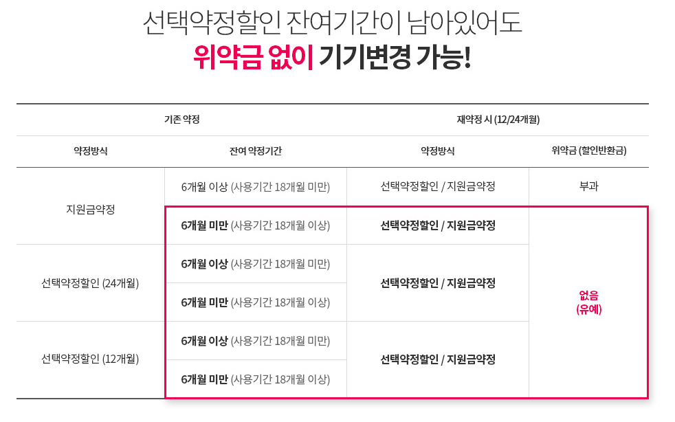 기존에 사용하던 폰 선택약정 할인 잔여기간 때문에 고민인 분들도 손쉽게 해결할 수 있는데요, 별도 위약음 없이 기기변경할 수 있도록 약정 방식이 변경됩니다. 때문에 기존 선택약정할인을 마져 채우지 못해 생기는 위약금은 걱정하지 않아도 된답니다. 유플러스니까요!