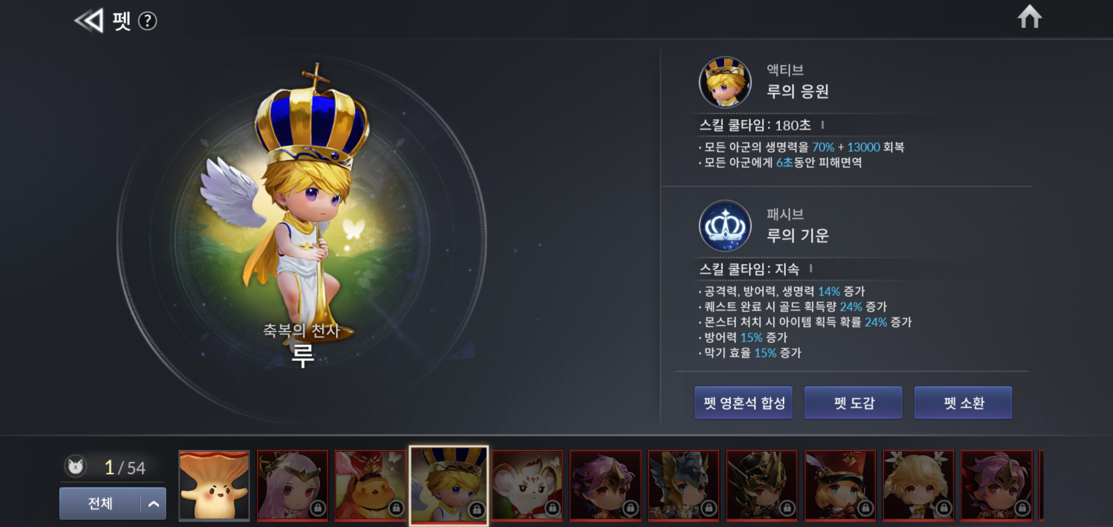 팀을 구성하는 영웅들 외에도 펫을 팀으로 구성해 도움을 받을 수 있기도 합니다. 초반에 획득 가능한 아기 버섯 푸리를 시작으로 각기 다른 패시브 스킬과 전투력을 가진 펫을 팀으로 편성하면서 보다 수월한 전투를 치를 수 있습니다. 펫이 가진 스킬을 적재적소에 사용하는 것 또한 중요하구요.