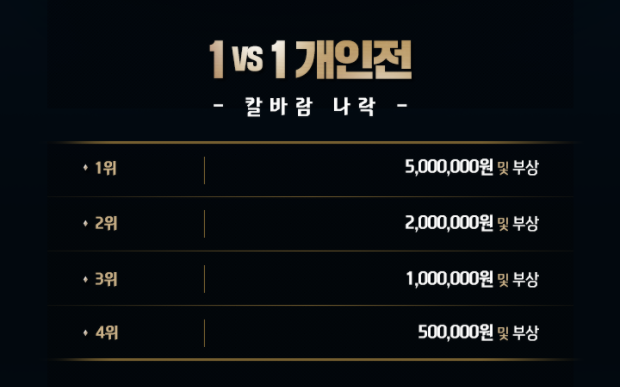 칼바람 나락에서 진행되는 1vs1 개인전에서도 순위에따른 상금과 부상이 주어집니다. 우선 1위에게는 상금 5백만원과 부상이 주어지고, 2위에게는 상금 2백만원과 부상이 주어집니다. 3위에게는 100만원과 부상 그리고 4위에게는 50만원과 부상이 준비되어 있습니다.