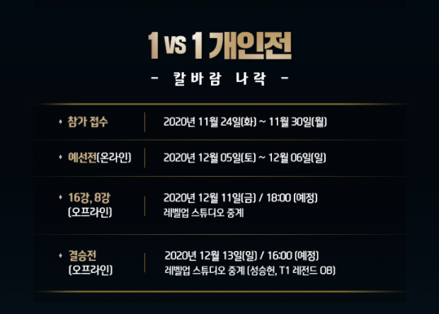 1vs1 개인전의 경우에도 단체전과 비슷한 일정으로 진행됩니다. 12월 5일과 6일 양일동안 온라인 예선전이 진행되며, 12월 11일 레벨업 스튜디오 중계로 오프라인 16강과 8강 경기가 진행됩니다. 최종 결승전은 12월 13일에 진행되는데요, 개인전 역시 단체전과 마찬가지로 단판제로 승부가 결정됩니다.