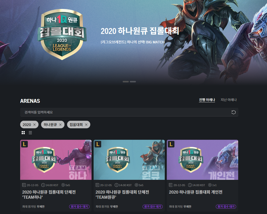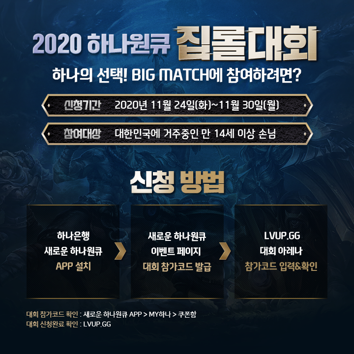 2020 하나원큐 집롤대회 신청은 11월 30일까지 진행됩니다. 대한민국에 거주하고 있는 만 14세 이상 손님이면 누구나 참여 가능합니다. 참여 방법도 간단한데요, 하나은행 새로운 하나원큐 APP을 설치하고 새로운 하나원큐 이벤트 페이지에 접속해 대회 참가코드를 발급받아 LVUP.GG 대회 아레나 참가코드 입력과 확인 절차가 끝나면 신청이 완료 됩니다. 단 단체전과 개인전 중복 참여가 불가하다고 하니 신중하게 선택하여 참여 하는 것이 중요합니다.