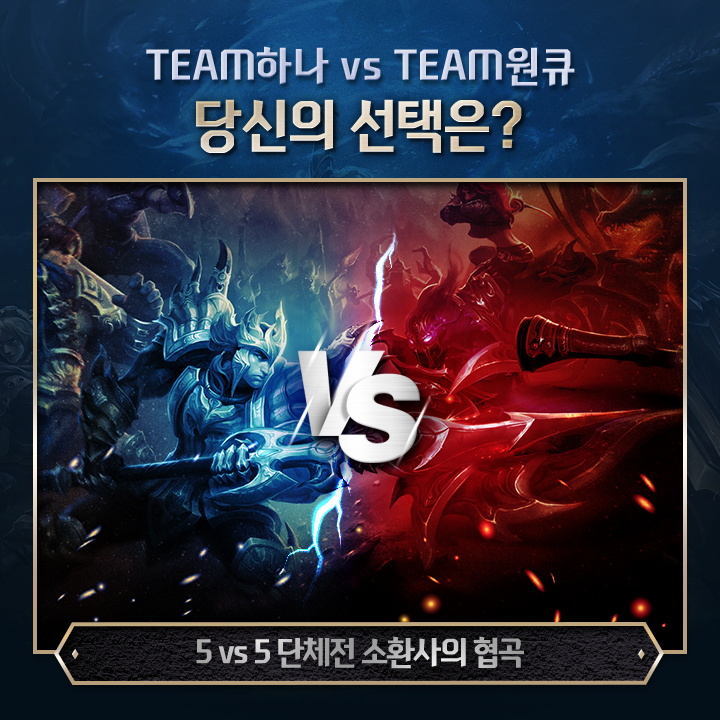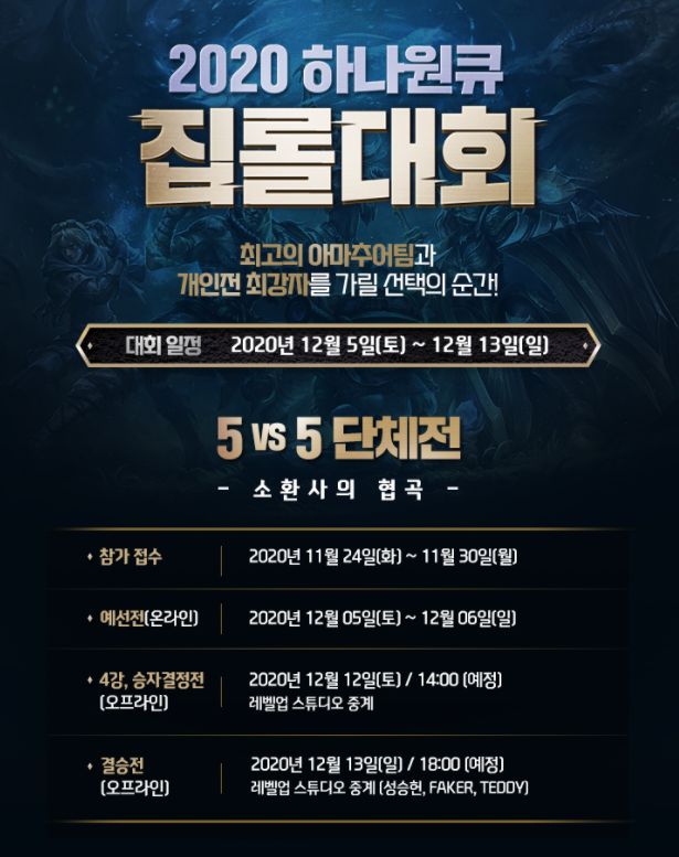 5vs5 단체전으로 진행되는 소환사의 협곡의 경우 TEAM 하나와 TEAM 원큐 2개의 아레나로 각각 진행됩니다. 각 아레나별 우승팀 간 대결로 최종 우승팀을 선정하게 됩니다. 아레나 형식으로 진행되는 만큼 어느 팀을 선택하느냐가 무척이나 중요한 단체전의 경우 참가 신청부터 전략적으로 구성하는 것이 좋은데요, 예비선수 1명을 포함한 최대 6명까지 팀으로 구성할 수 있습니다. 특히 이번 2020 하나원큐 집롤대회의 경우 개인전 4강과 결승전 오프라인 경기에서는 T1 선수가 직접 등장해 깜짝 해설을 한다는 소식입니다.