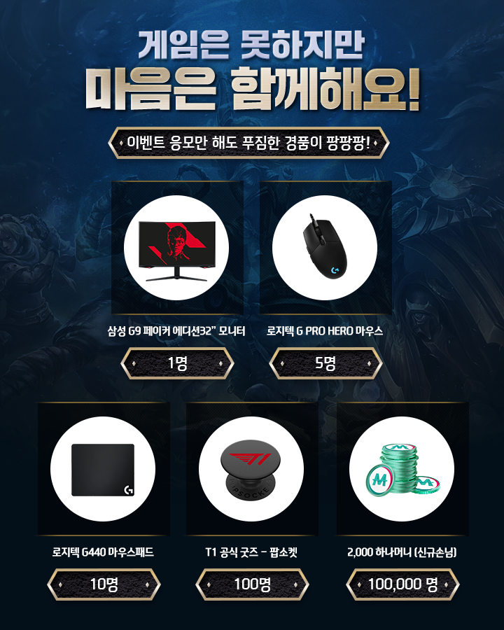 리그오브레전드를 좋아하지만 직접 대회에 참여를 못하는 분들을 위한 특별한 이벤트도 진행됩니다. 11월 24일부터 11월 30일까지 새로운 하나원큐 이벤트 페이지를 통해 응모하면, 추첨을 통해 2억 하나머니와 삼성G9 페이커 에디션 32모니터, 로지텍 G PRO HERO마우스를 비롯해 로지텍 마우스패드와 T1공식 굿즈까지 준비되어 있어 놓치기 아쉬울 정도입니다.
