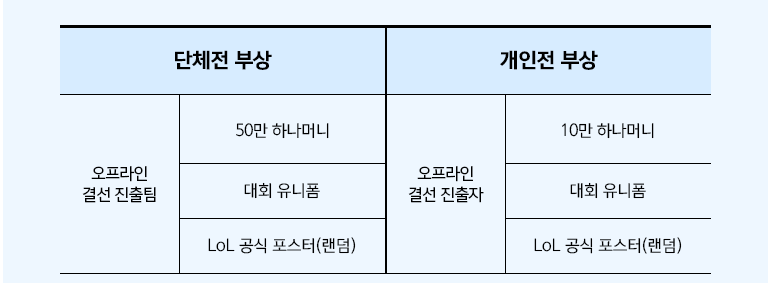 단체전과 개인전 상금도 어마어마하지만, 부상으로 주어지는 선물도 특별합니다. 단체전의 경우 오프라인 결선에 진출한 8개팀 모두 50만 하나머니와 대회 유니폼 그리고 LOL 공식 포스터(랜덤)가 주어지고, 개인전의 경우에도 10만 하나머니와 대회 유니폼 그리고 LOL 공식 포스터(랜덤)을 부상으로 받게 됩니다.