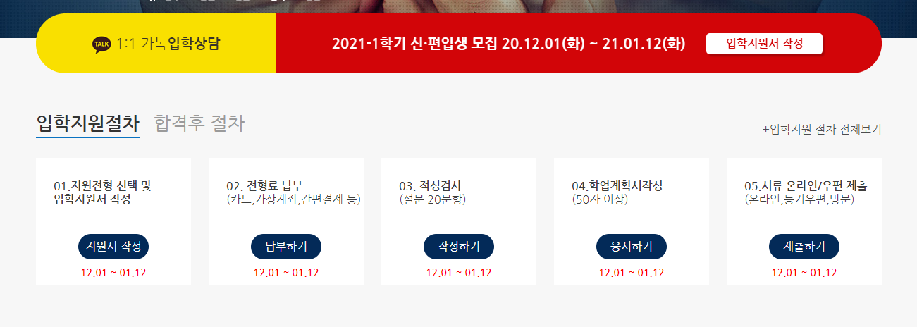 언택트 사회에서 더욱 주목받고 있는 사이버대학교 서울디지털대학교에서 2021학년도 1학기 신.편입생 모집이 진행 중입니다. 12월 1일부터 시작된 모집은 2021년 1월 12일까지 진행되며 온라인 입학지원서를 작성하고, 적성검사와 학업계획서등의 순서로 진행됩니다. 특히 2021년 입학생이면 누구나 1년간 15% 수업료 감면이 되는 점은 이번 2021학년 1학기 입학을 고심해야 할 중요한 이유이기도 합니다.