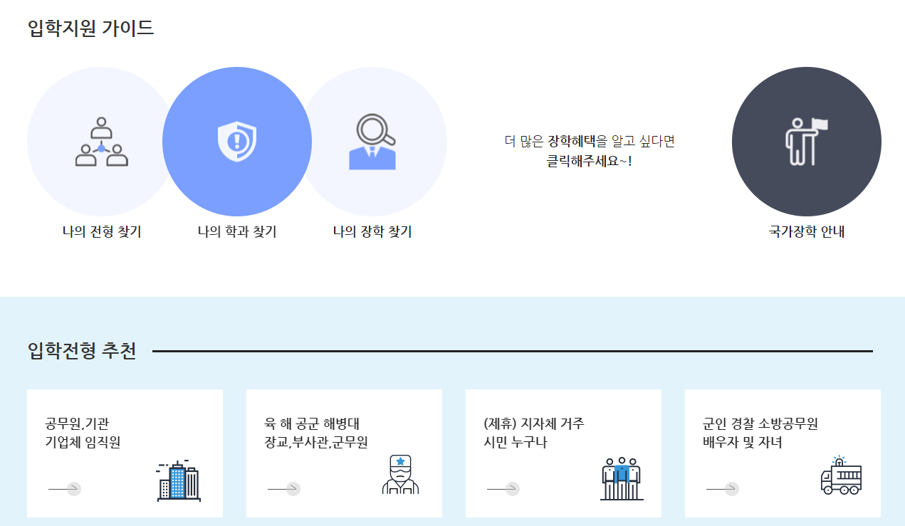 입학관련 본인의 전형이나 원하는 학과 및 장학등 여러 궁금한 사항들은 홈페이지에서 제공되고 있는 입학지원 가이드를 활용하면 보다 손쉽게 확인할 수 있습니다. 입학전형 추천의 경우 공무원, 기관, 기업체 임직원부터 시작해 지차체 거주 시민등 여러 전형이 구성되어 있고, 받을 수 있는 장학혜택도 꼼꼼하게 확인할 수 있으니 참고하시면 좋을 것 같습니다.