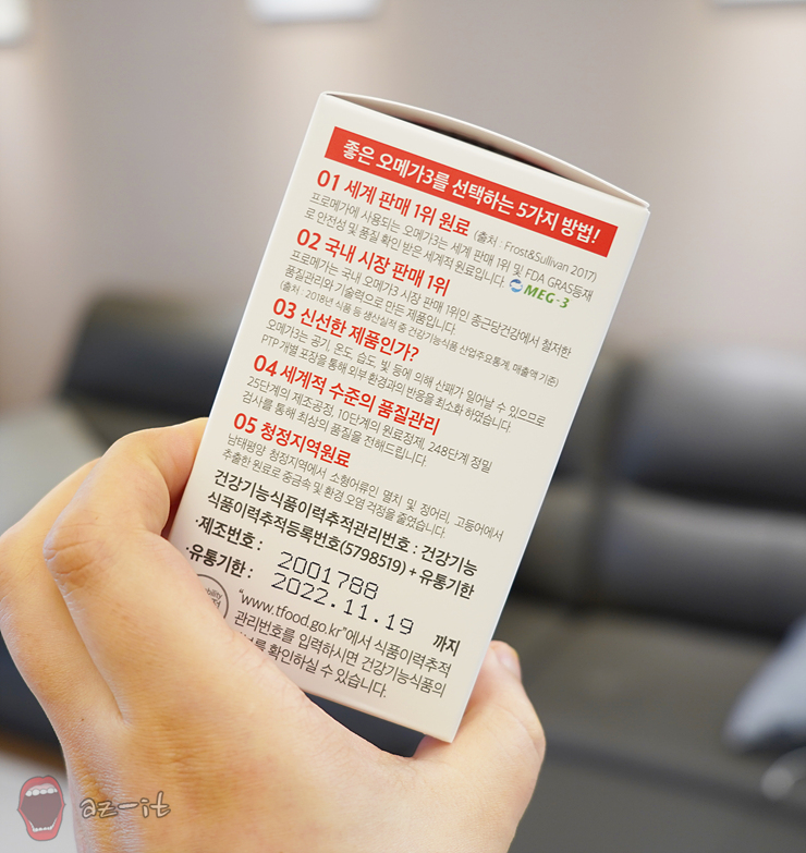 원료 역시 꼼꼼히 따져보아야 하는 부분 중 하나인데요, 세계판매 1위의 고품질 원료를 사용하고, FDA, GRAS 등재된 원료로 안전성과 품질까지 확인되어 믿을 수 있어 신회가 가더군요. 또한 남태평양 청정바다에 서식하는 소형어류(고등어, 정어리, 멸치등)을 사용해 중금속과 해양오염물질로부터 안전해 염려하지 않아도 될 정도입니다.