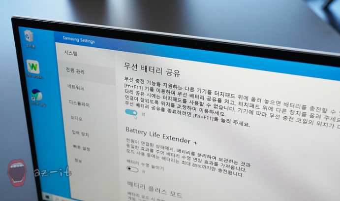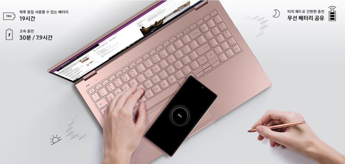 갤럭시북 이온의 경우 무선충전도 가능하도록 디자인되어 있는 점을 빼 놓을 수 없습니다. 터치패드에 무선 충전 기능이 있어 스마트폰이나 무선 이어폰등 무선 충전이 가능한 기기들을 손쉽게 충전할 수 있습니다. 외부에서 전원코드를 찾을 필요가 없으니 얼마나 편하던지 한번 경험해 보면 없어서는 안될 기능이라고 생각될 정도로 편리합니다.