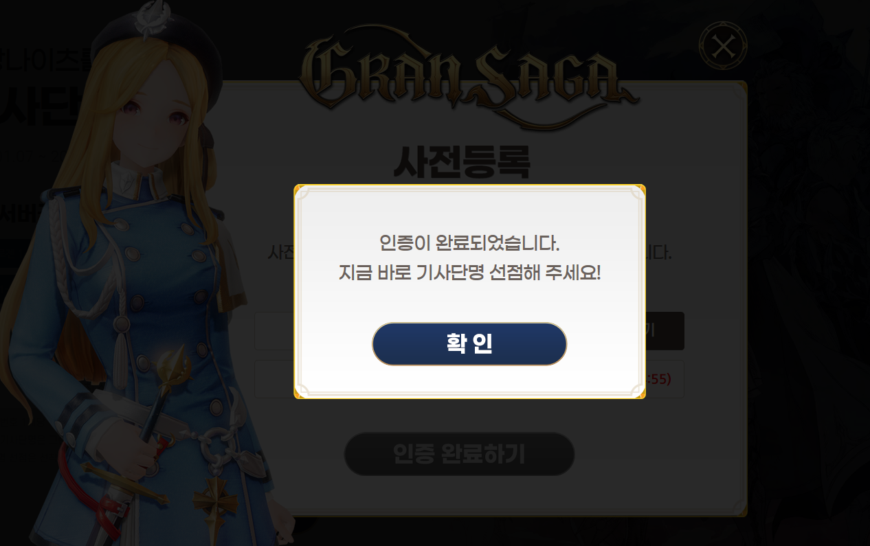 휴대폰 번호를 입력하면 카카오톡을 통해 전달되는 인증번호를 기재하면, 인증 완료 팝업창과 함께 지금 바로 기사단명 선점을 진행하라는 메세지를 받을 수 있습니다.