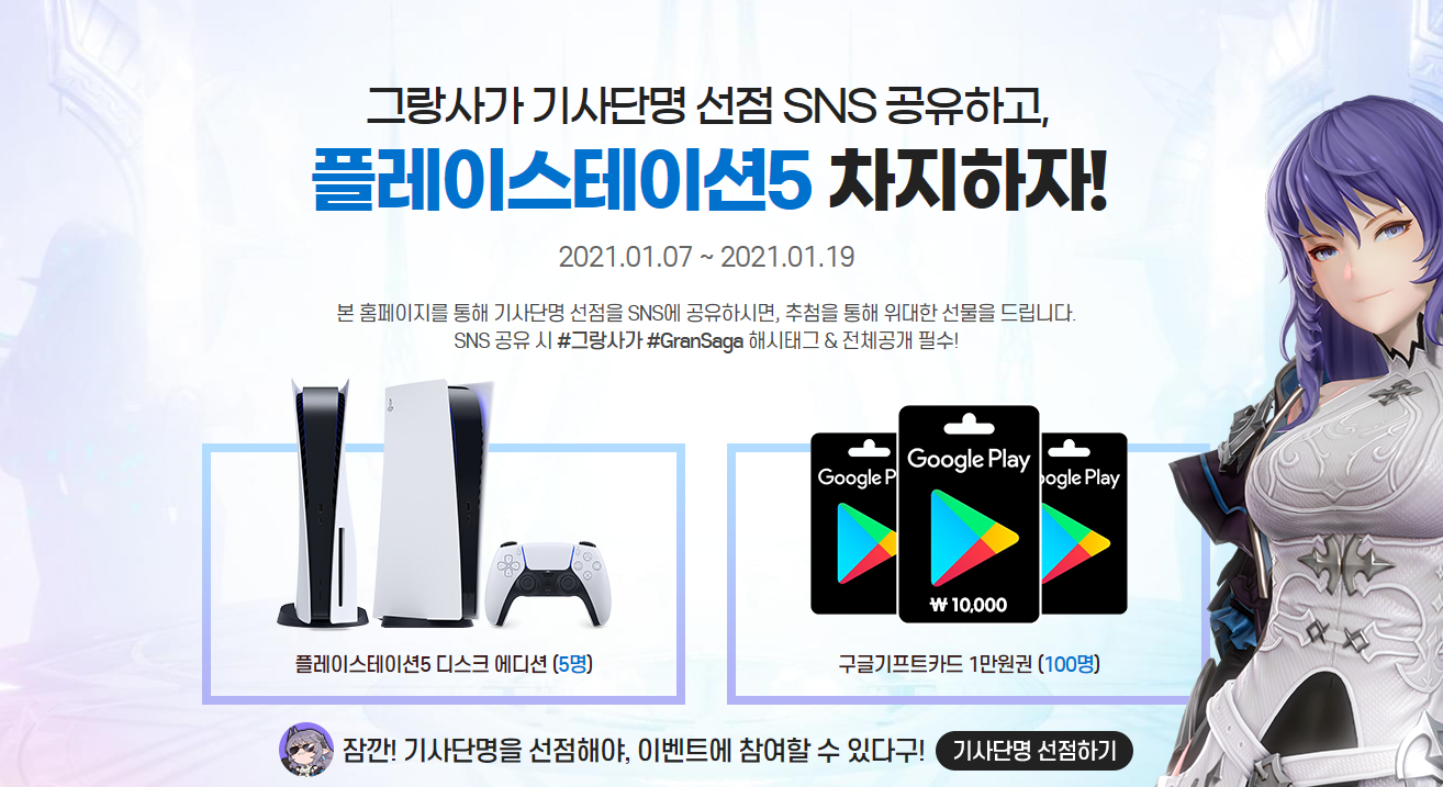 기사단명 선점을 완료했다면, 트위터와 페이스북을 이용한 SNS 공유를 진행하고 플레이스테이션 5 디스크 에디션과 구글 기프트카드 1만원의 선물을 받을 수 있는 이벤트에 참여 가능합니다. SNS 공유시 #그랑사가 #GranSaga 해시태그를 사용하고, 전체 공개는 필수적으로 해야 추첨 대상에 포함되니 잊지마시구요!