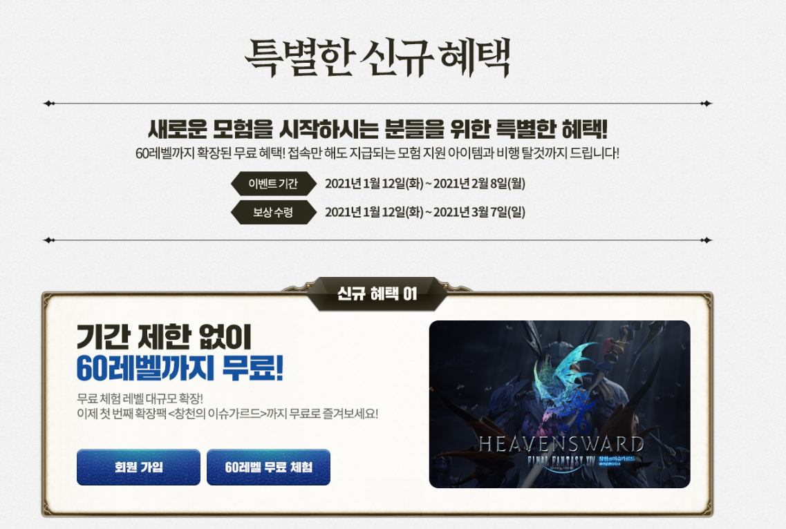 무료체험 구간도 확장되었습니다. 이전에는 35레벨까지만 무료체험이 가능했는데요, 60레벨까지 늘어나 보다 흥미진진한 PCMMORPG 파이널판타지14를 즐길 수 있게 되었습니다. 뿐만 아니라 확장팩 창천의 이슈라그르와 홍련의 해방자 그리고 60레벨 퀘스트 랄거의 부족 진행도 가능한데요, 60레벨까지 클래스 및 잡, 생활 직업 육성까지 가능합니다.