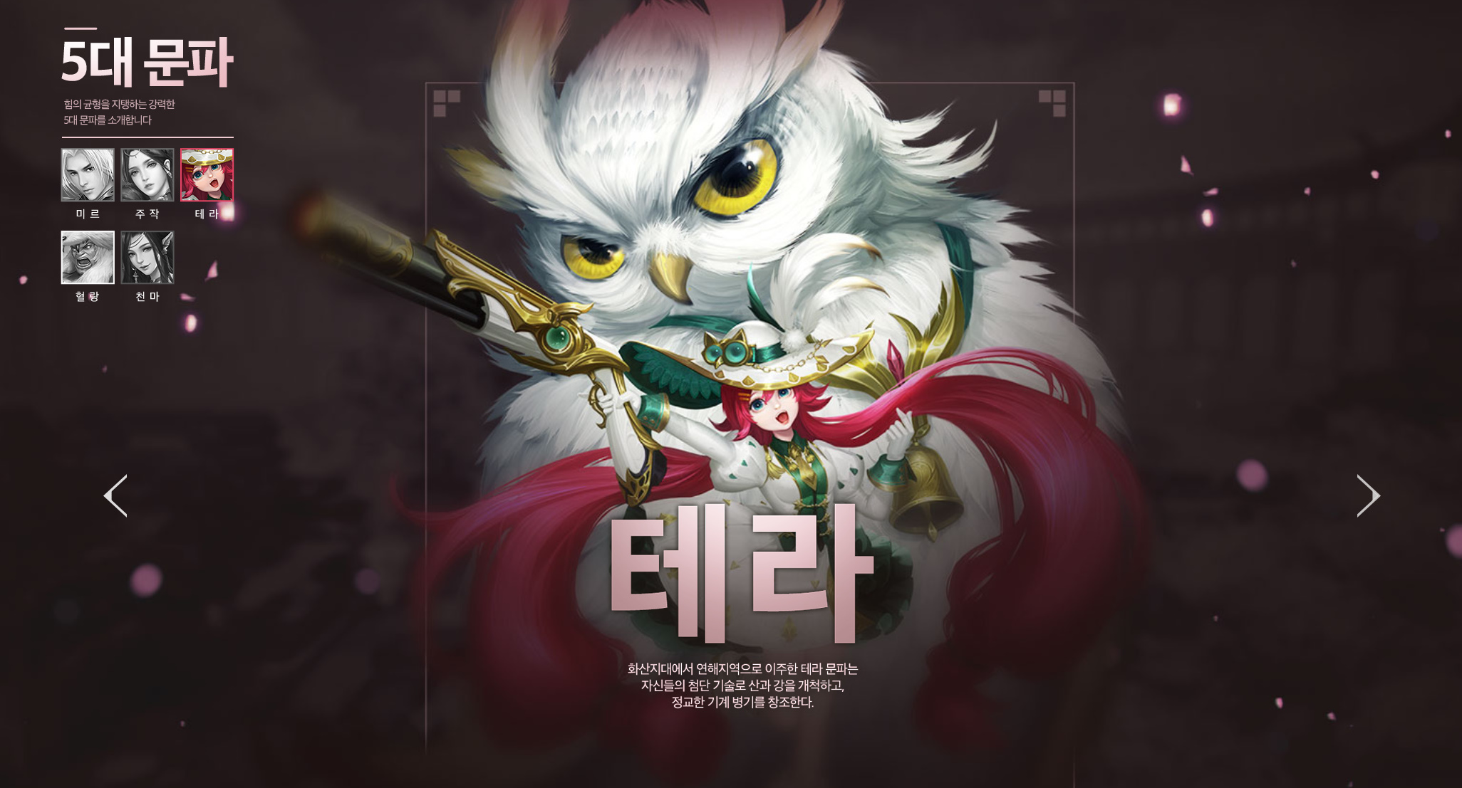힘의 균형을 지탱하는 강력한 5대 문파에 대한 정보도 공개되었습니다. 용을 신앙으로 삼는 당대 최강의 문명세력이자 가장 많은 인구를 보유한 미르 문파를 시작으로 첨단기술로 산과 강을 개척하고 정교한 기계병기를 창조하는 테라, 악마를 숭배하고, 강화를 마화시키면서 무너트리는 것을 목표로 하는 천마, 그리고 혈랑과 주작에 이르기까지 각기 다른 특징과 특색을 갖추고 있는 문파들을 통해 진행되는 스토리가 어떻게 펼쳐질지 기대가 될 정도입니다.