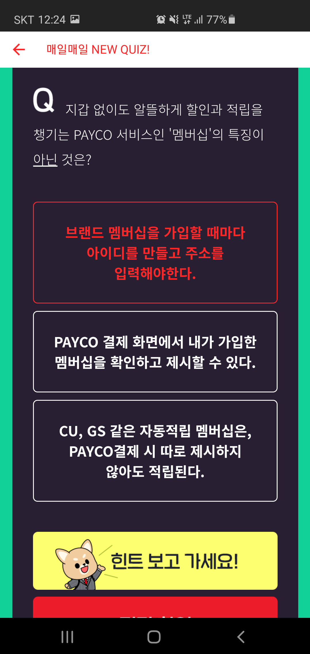 오늘의 문제인 페이코 서비스 멥버십과 관련된 문제와 관련된 힌트를 알아보니 페이코 멥버십 페이지가 열리면서 관련 혜택들은 어떤 것들이 있는지 한눈에 확인할 수 있었는데요, 아리송한 문제가 있거나, 꼭 정답을 맞혀 포인트를 획득하고 싶은 분들이라면 힌트 확인을 지나치면 안 될 것 같습니다.