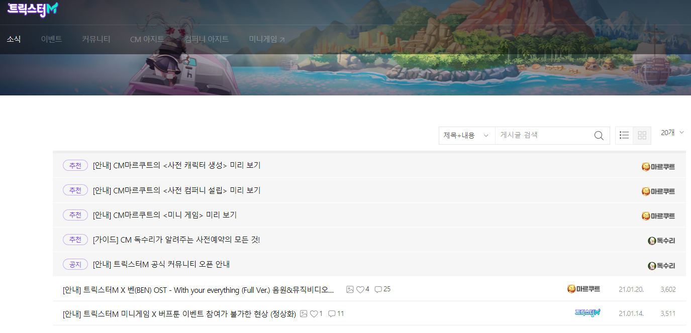 트릭스터M 과 관련된 발빠른 소식은 트릭스터 커뮤니티를 통해 접할 수 있습니다. 사전예약 이벤트를 비롯해 다양한 이벤트도 진행 중이고, 사전 컴퍼니를 구성한 다른 유저들과 소통도 가능해 기다리는 시간이 지루하지 않을 정도 입니다. 벤 OST 공개 이후 또다른 좋은 소식이 곧 들리지 않을까 기대감도 커뮤니티를 통해 전해지는 중인데요, 아직 사전예약에 참여하지 않은 분들이라면 서둘러 참여하시고, 론칭과 함께 트릭스터M과 함께 하는 모험을 즐겨보시기 바랍니다!