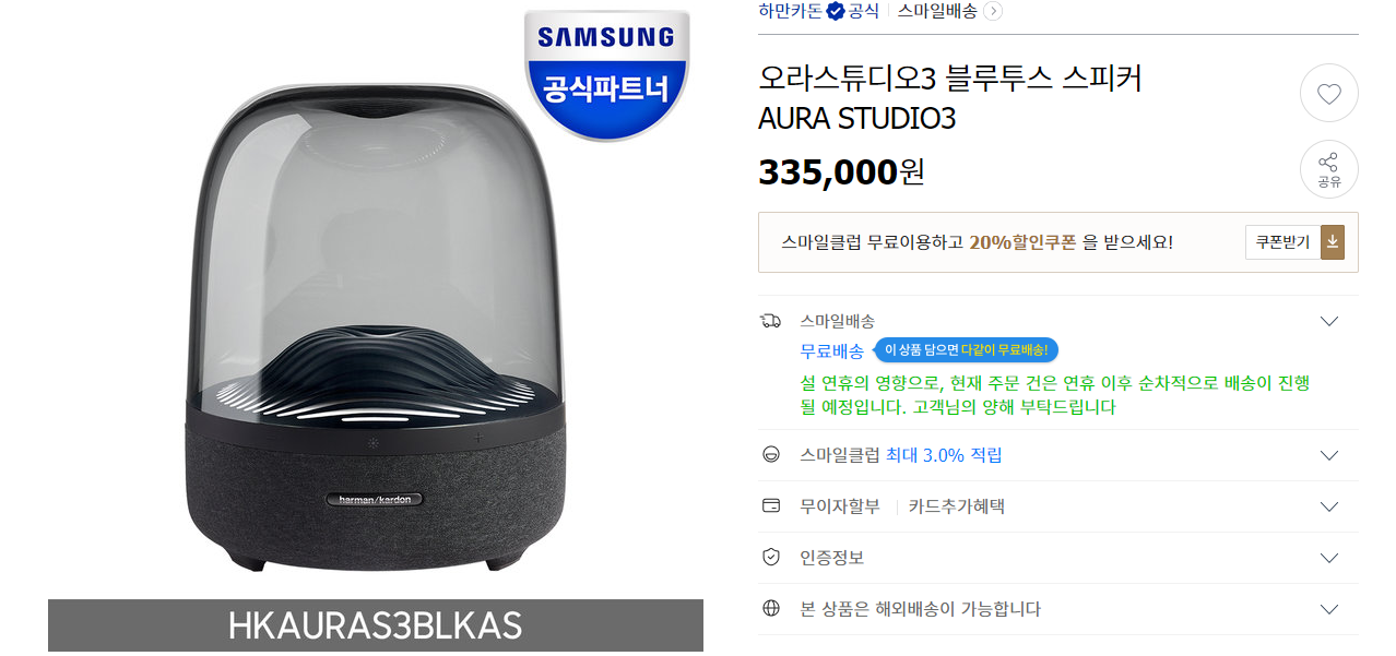 눈을 뗄 수 없는 사운드 한마디로 요약 가능한 하만카돈 오라스튜디오3 블루투스 스피커도 할인 혜택에 포함되었습니다. 사운드의 미학을 담은 돔 스타일의 시그니처디자인과 전 방향에서 소리를 뿜어내는 6개의 미드-하이 레인지, 하단에 탑재된 100W의 웅장한 베이스까지 눈과 귀를 모두 사로잡는 블루투스 스피커를 원한다면 하만카돈 오라스튜디오3가 답입니다.