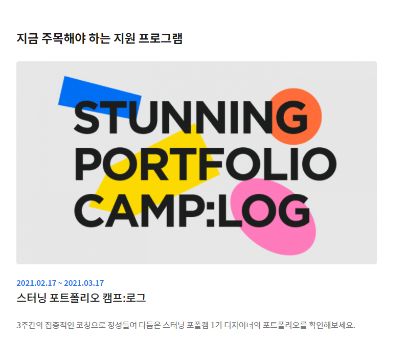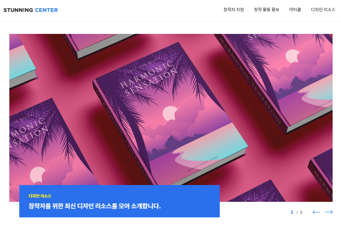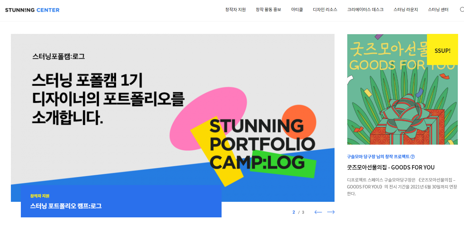 디자인참고사이트 스터닝센터가 여느 사이트와 차별화된 점들도 상당한데요, 먼저 창작자 지원 프로그램을 운영해 창작자 분들에게 도움이 될 수 있는 창작 프로젝트를 홍보해 준다거나, 다른 창작자의 작품을 통해 영감을 얻을 수 있도록 다양한 구성이 준비되어 있습니다.