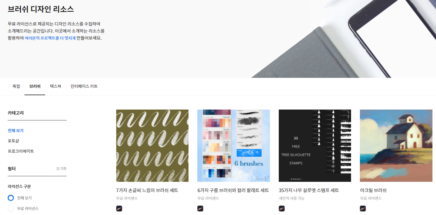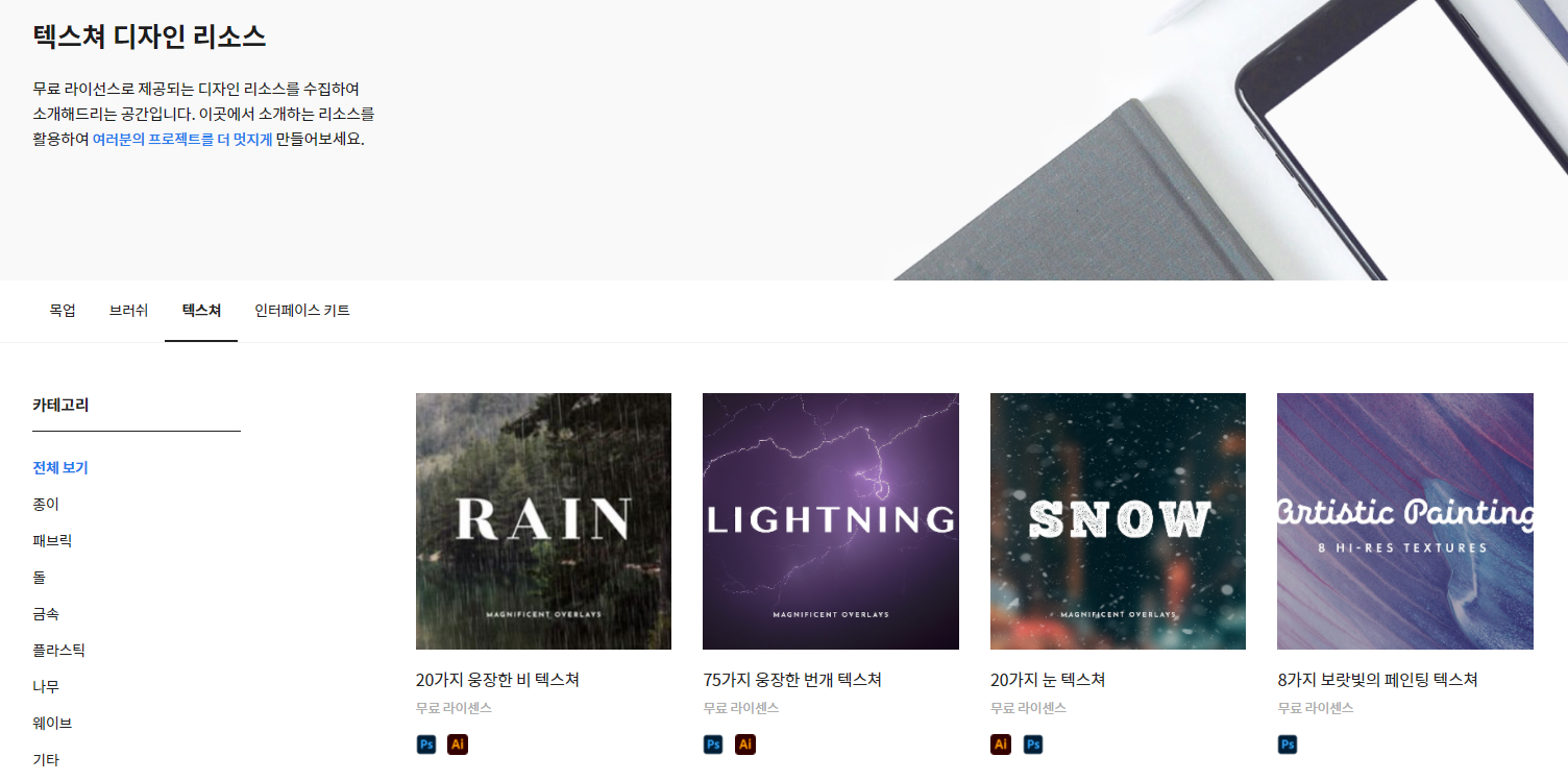 디자인참고사이트 스터닝센터의 큰 장점 중 하나 바로 디자인에 필요한 리소스를 무료로 얻을 수 있다는 점입니다. 목업리소스부터 브러쉬, 텍스쳐, 인터페이스 키트에 이르기까지 무료 라이선스 리소스를 제공하고 있어 필요에 따라 활용 가능합니다.