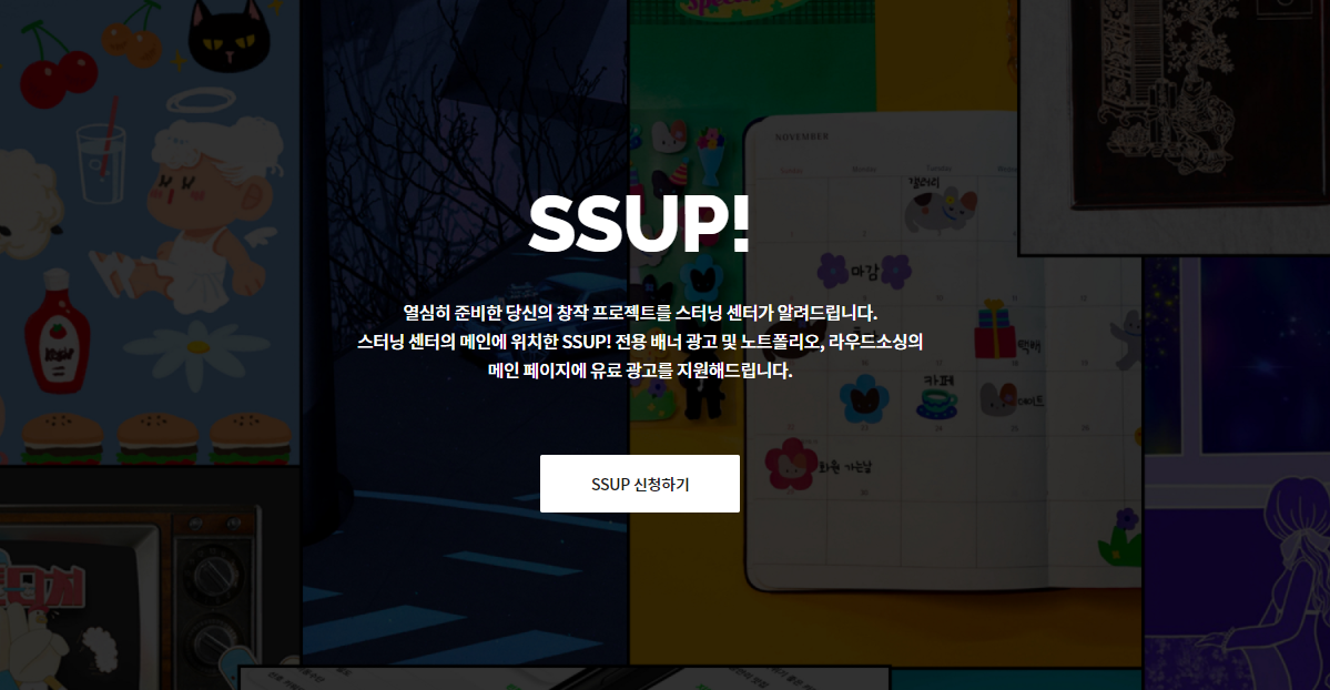 아무리 열심히 준비하고 만들었다고 해도, 홍보할 수 있는 수단이 없다면 실력을 알리기가 쉽지 않은데요, 스터닝센터에서는 SSUP 프로그램의 일환으로 스터닝센터 메인에 위치한 전용 배너 광고와 포트폴리오, 라우드소싱의 메인페이지 유료광고를 지원해 도움을 받을 수 있기도 합니다.