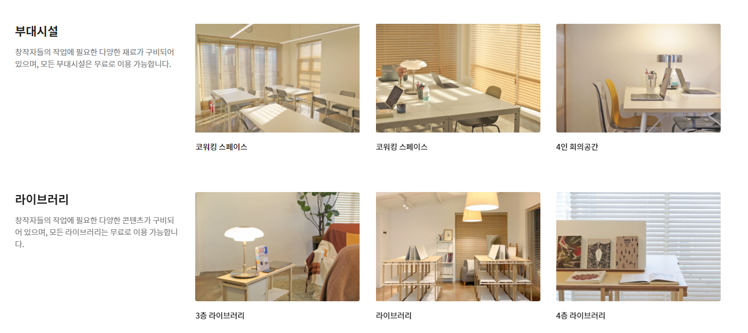 창작자를 위한 코워킹 스페이스의 경우 부대시설과 라이브러리가 다양하게 구성되어 있으며, 모든 부대시설과 라이브러리는 무료로 이용 가능합니다. 사용자격의 경우에도 전문창작자부터 예비창작자와 일반인까지 모두 가능하다고 하니 디자인에 참고하시면 좋을것 같습니다.
