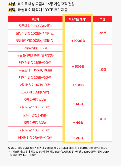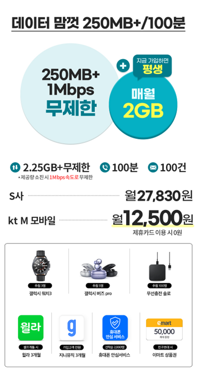 데이터맘껏 250MB+100분 요금제의 경우에도 1만원대 비용으로 이용 가능합니다. 무엇보다 1Mbps속도로 무제한 사용 할 수 있다는 점이 가장 큰 장점인데요, 데이득 프로모션이 현재 진행중에 있어 지금 가입하면 평생 매월 2GB의 데이터를 무료로 받을 수 있습니다.
