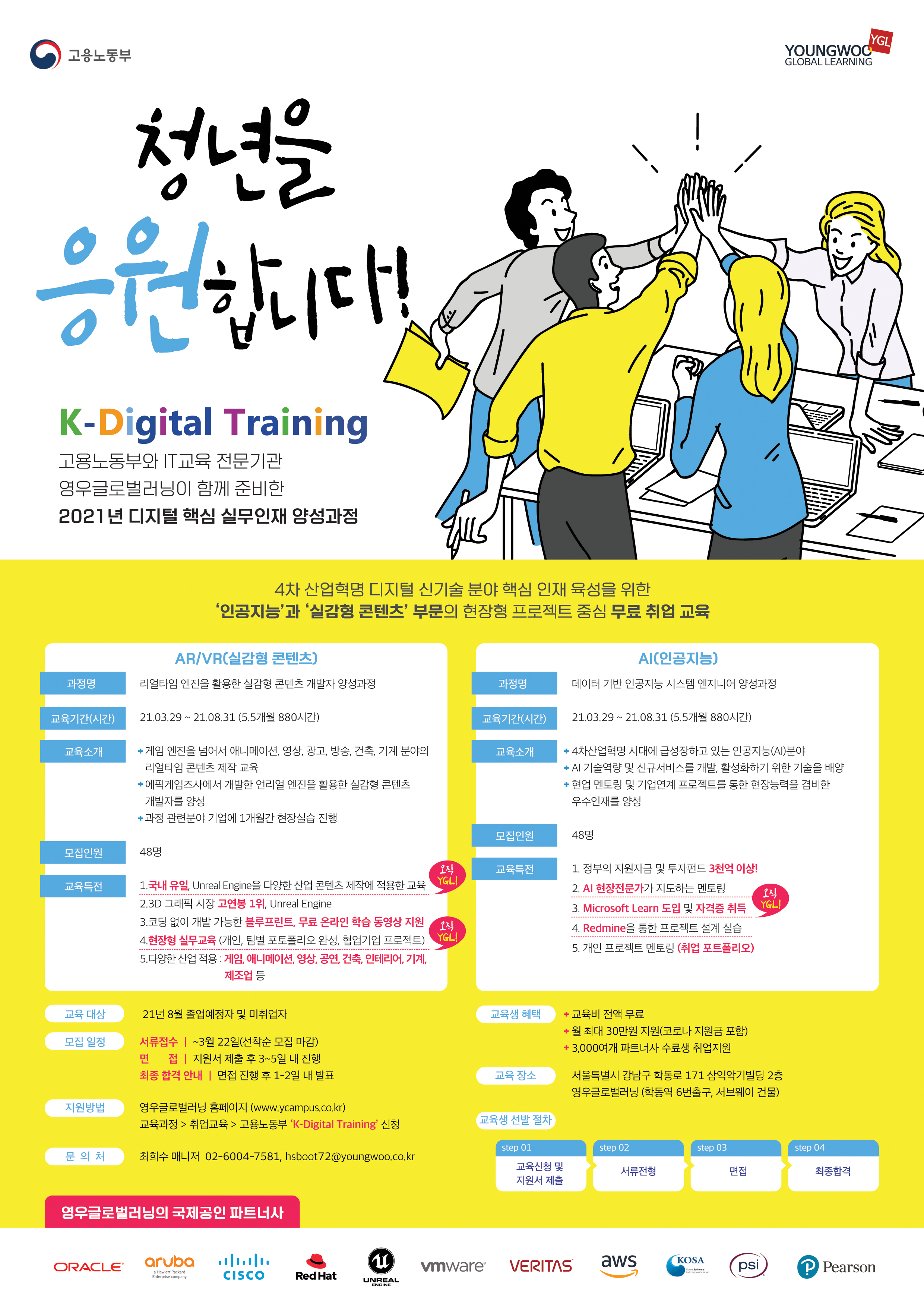 디지털 산업에서도 핵심이라고 할 수 있는 AI와 관련해 관심을 가지고 있고, 관련 교육을 진지하게 고민하고 계신 분들이라면 영우글로벌에서 준비한 K-Digital Training과정을 통해 한발 앞서 준비하고, 시작해 보다 빛나는 미래를 시작해보시기 바랍니다.