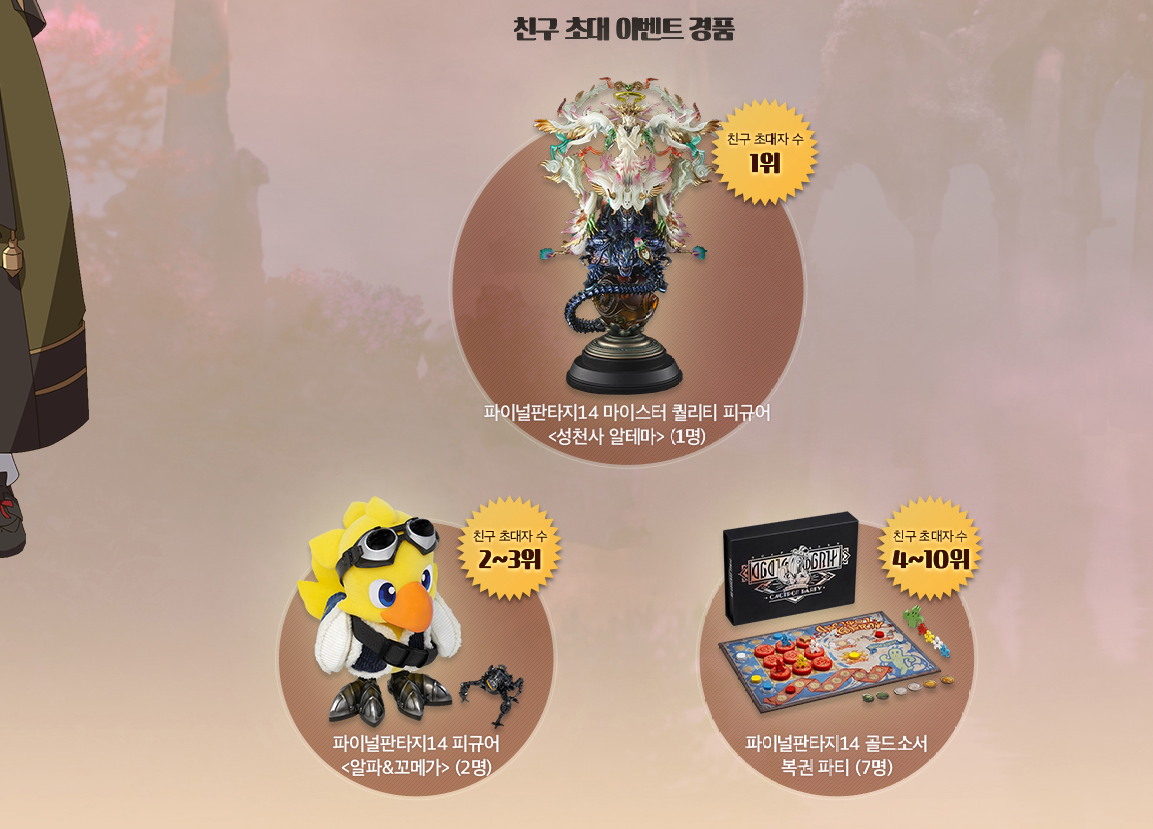 영상 공개 기념 친구 초대 이벤트도 진행되고 있습니다. 3월 15일까지 진행되는 친구초대 이벤트에 성공한 인원 중 추첨을 통해 파이널판타지14 골드소서 복권파티, 알파& 꼬메가 피규어, 마이스터 퀄리티 피규어인 성천사 알테마를 순위에 따라 선물로 주어집니다.