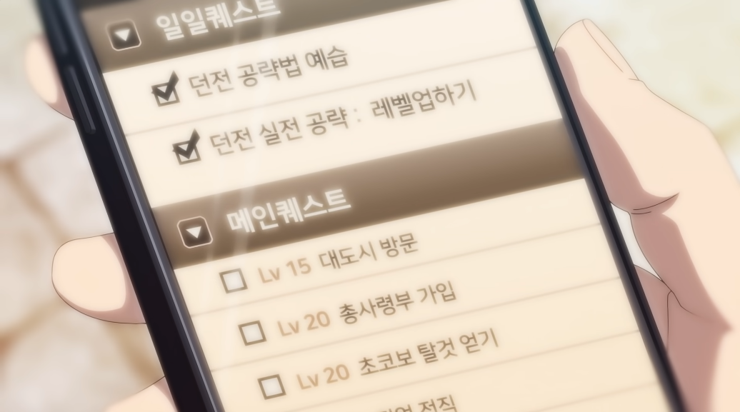 이내 뭔가 깨우친듯한 모습 으로 할일 목록이 가득 적힌 핸드폰을 꺼버리고 핸드폰을 던지는 주인공! 오늘은 어디까지 진행하고, 목표를 세우고 하지 않아도 된다는 걸. 서두르지 않아도 괜찮다는 걸 깨닫고는 이내 핸드폰을 던저버리는 모습입니다. 꼭 퀘스트를 따라 움직이지 않아도, 몬스터와의 사냥이 주가 되지 않아도 되다는 모습은 보는 이로 하여금 웃음짓게 만드는 부분이도 합니다.