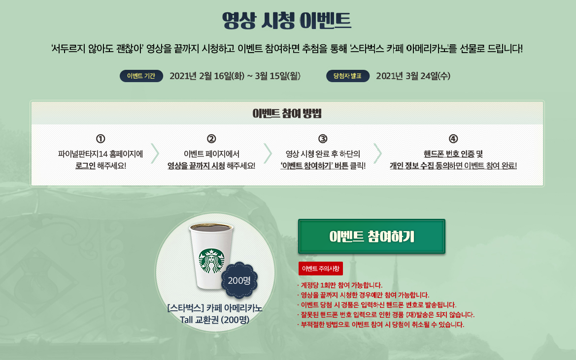 힐링게임의 매력을 온전히 보여주고 있는 파판14 서두르지 않아도 괜찮아 영상관련 이벤트도 진행 중입니다. 파이널판타지14 홈페이지에 로그인하고, 이벤트 페이지에서 영상을 끝까지 시청한 다음 이벤트 참여하기 버튼을 클릭 후 참여하면 추첨을 통해 200명에게 스탁벅스 아메리카노를 선물로 지급합니다.