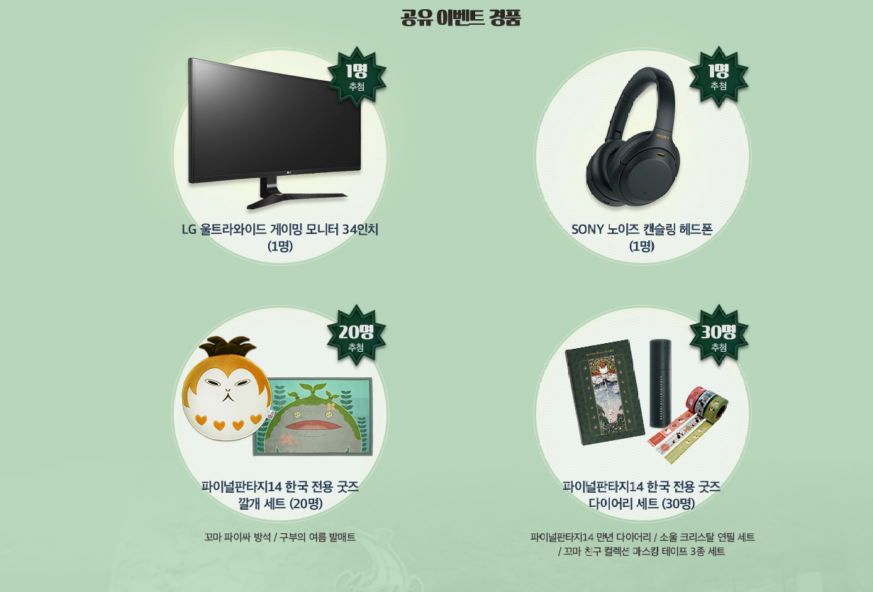 서두르지 않아도 괜찮아 영상 공유 이벤트도 진행 중입니다. 영상을 본인의 SNS에 #파이널판타지14, #서두르지않아도괜찮아, #60레벨, #무료체험 필수해시태그를 포함해 공유한 뒤 URL을 이벤트 페이지 댓슬로 남기면 참여가 완료됩니다. 참여한 분들 중 추첨을 통해 파판14 한국 전용 굿즈 깔개 세트부터 다이어리세트, 소니 노이즈 캔슬링 헤드폰, LG 울트라 와이어 게이밍 모니터 34인치를 선물로 증정합니다.
