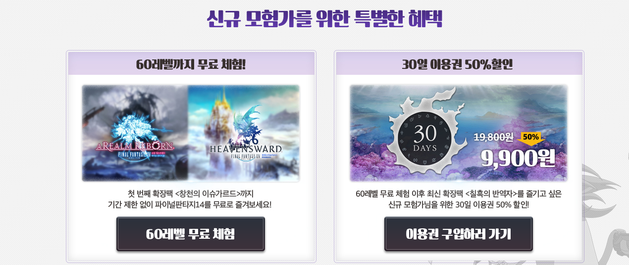 친구초대 이벤트라던가, 영상공유 참여등 여러 경로를 통해 힐링게임 파이널판타지14를 즐기는 분들에게는 특별한 혜택도 주어집니다. 우선 첫번째 확장팩 60레벨까지 무료로 즐길 수 있는 기회가 주어집니다. 이후 확장팩까지 달리는 분들에게는 30일 이용권 50% 할인혜택이 주어지고 있어 시작하기 딱 좋은 타이밍이 아닐까 합니다.