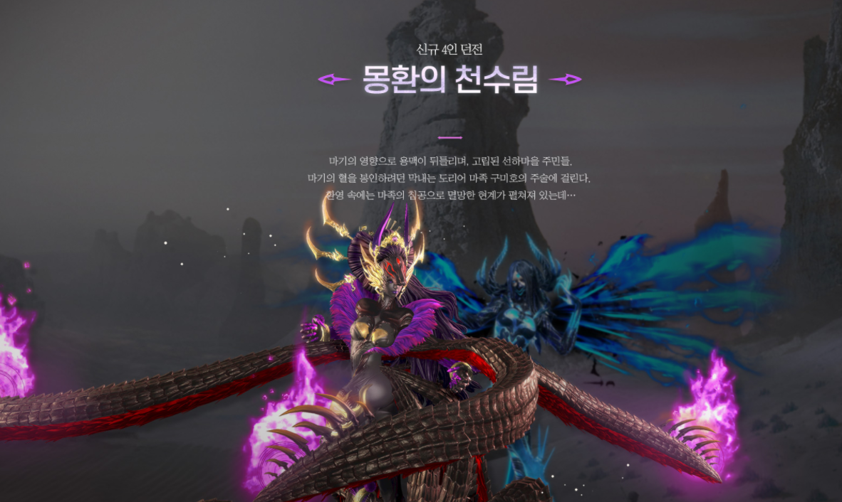 가장 빠르게 선보이는 4인 던전은 몽환의 천수림입니다. 3월 17일 오픈되는 신규 4인 던전인데요, 현재 공개된 내용으로는 환영에 따라 바뀌는 보스의 몸짓에 따라 빠른 판단과 민첩한 대응이 필요한 던전으로 알려져 있습니다. 아무래도 처음 열리는 4인던전인 만큼 파티원들과 손발을 맞추는 과정에 시간이 걸리지 않을까 생각되는데요, 어느 파티가 가장 먼저 몽환의 천수림에 도전에 성공할지 기대되기도 합니다.