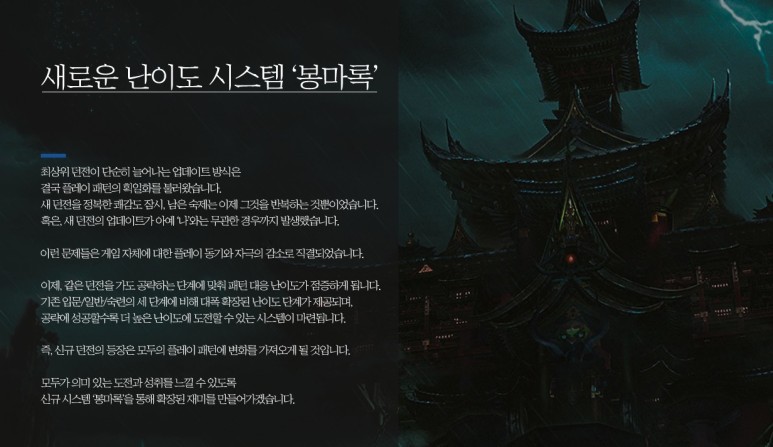 신규 난이도 시스템인 봉마록이 도입됩니다. 최상위 던전이 단순히 늘어나는 방식의 업데이트의 경우 플레이 패턴의 획일화를 불러오는 이유가 되기도 했는데요, 봉마록을 도입함으로써 같은 던전이라고 하더라도 난이도에 따라 패턴이 달라져 공략의 재미를 더해준다고 합니다.