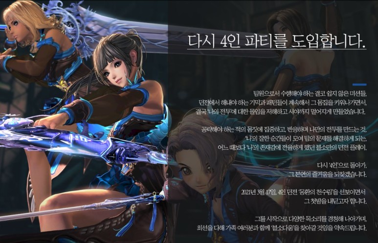 온라인게임추천 블소의 대규모 업데이트 태동록은 블소를 더욱 블소답게 만들면서 유저들을 위해 처음으로 돌아가는 마음으로 컨버팅 작업을 한다는 점이 대단하게 느껴질 정도입니다. 신규 4인 던전을 시작으로 재탄생이라는 말이 어울릴 정도로 변화를 예고하고 있는 블레이드앤소울. 과연 모든 업데이트가 끝난 후 어떤 모습일지 벌써부터 기대됩니다.