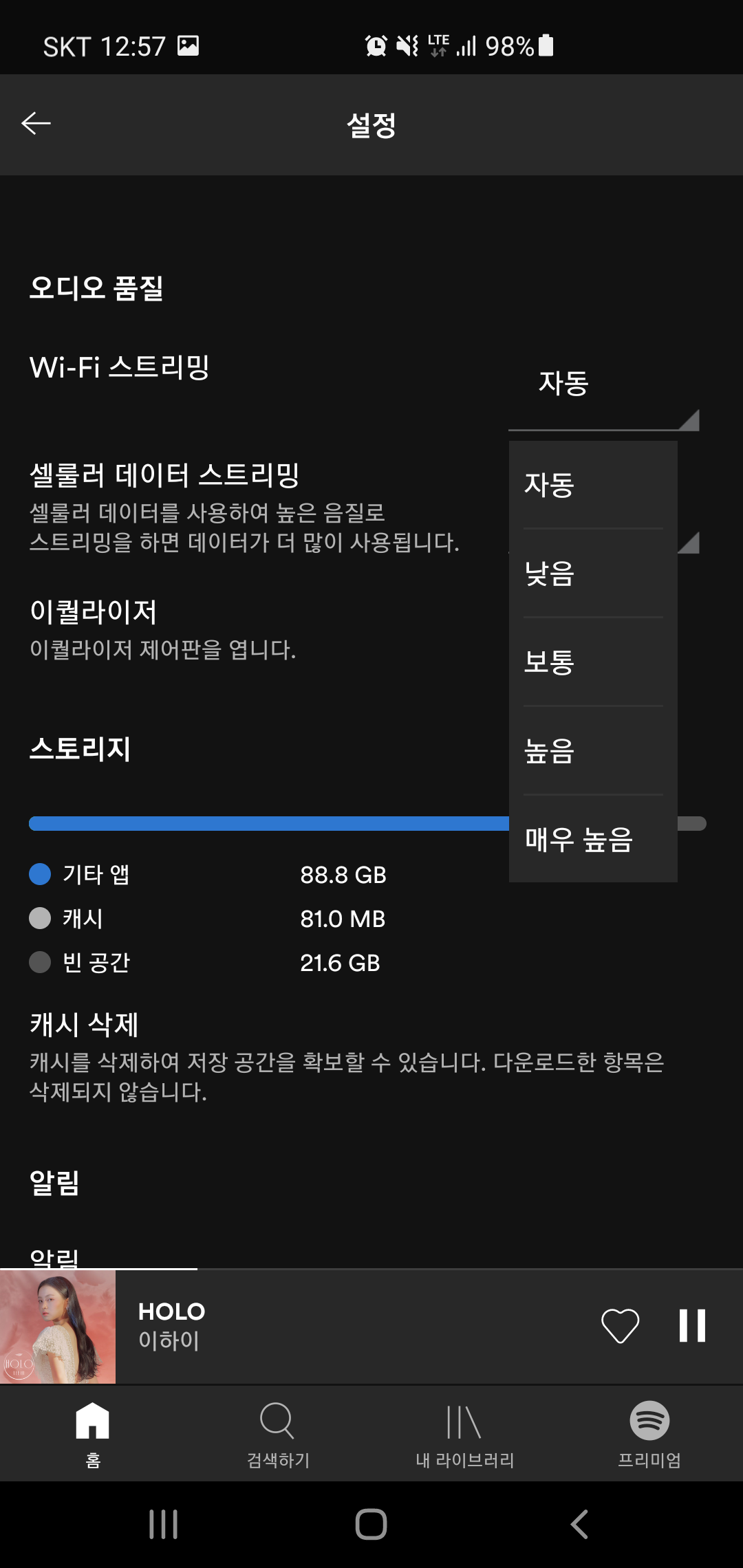 음질에 대한 부분은 최고라고 할 수 있었습니다. 음원도 다양해서 좋지만 음질은 두말할 필요가 없을 정도였는데요, WI-FI 스트리밍을 매우 높음으로 설정하면 최고 수준의 고해상도 음원을 들을 수 있고, 이퀄라이저를 이용할 수 있어 원하는 스타일의 음악을 들을 수 있습니다.