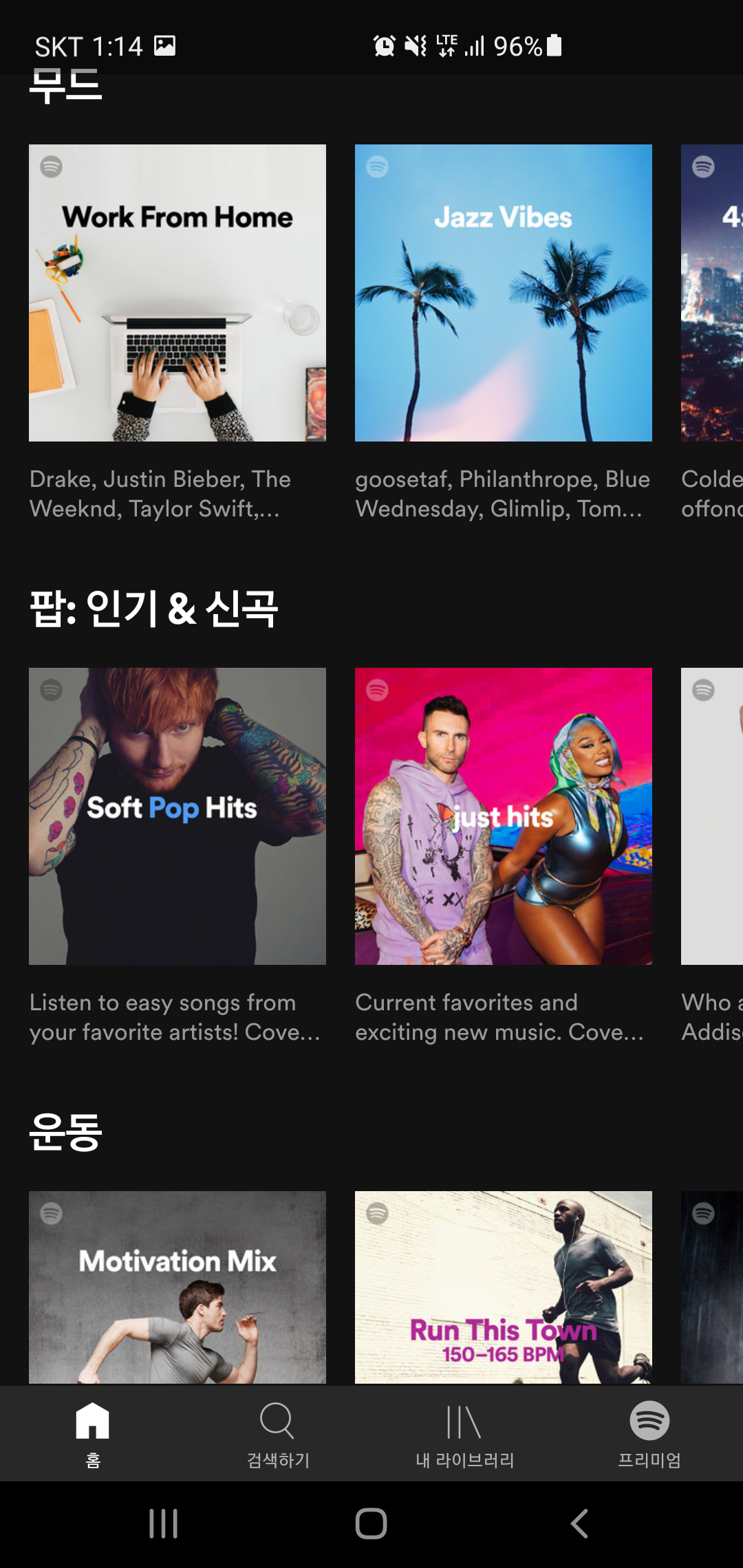 스포티파이를 사용하는데 있어 가장 큰 장점은 분위기나 상황, 장르에 따라 선택 가능한 플레이리스트가 상당하다는 점입니다. 좋아하는 곡들을 플레이 리스트에 넣고 랜덤 플레이를 선택한다고 해도 매번 그노래가 그 노래여서 아쉬웠다면 수 많은 플레이 리스트는 취향에 맞는 음악을 그때 그때 달리 들을 수 있으니 참 좋더군요.