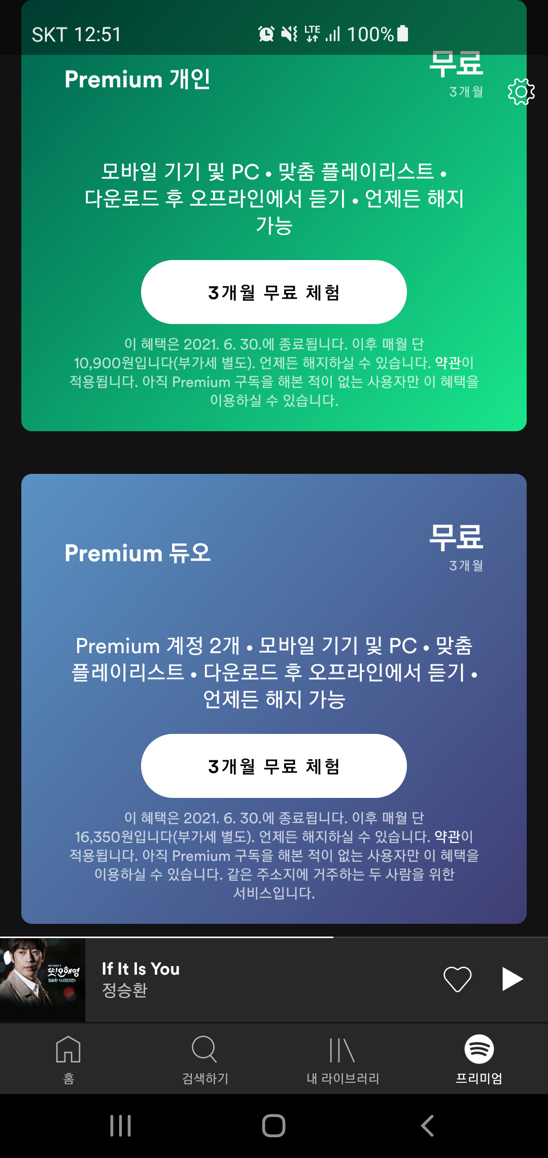 음악앱추천 스포티파이 이용료는 두가지중 하나를 선택해야 합니다. 프리미엄 1인 요금제는 월 10,900원(vat별도) 비용이 적용되며, 스포티파이 2인 요금은 월 16,350원(vat별도)비용을 지불해야 합니다. 가격대 자체는 저렴하다는 느낌은 들지 않더군요.